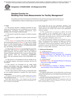 ASTM E1836/E1836M-09(2016) is a standard published by ASTM International. Its full title is "Standard Practice for Building Floor Area Measurements for Facility Management". This standard covers: SIGNIFICANCE AND USE 4.1 This practice can be used to facilitate comparison of areas that have been measured but it does not specify what measurements must be conducted. 4.2 This practice can be used in space programming and forecasting of space requirements. 4.3 This practice can be used to classify areas for internal cost accounting purposes. 4.4 This practice can be used to compare space use between organizations. SCOPE 1.1 This practice provides a definitive procedure for measuring and classifying floor area in buildings for use in facility management, specifying occupant requirements, space planning, and for strategic facility planning. 1.2 This practice specifies the sequence in which to measure floor area. 1.3 This practice is applicable to owned, rented, and leased buildings. 1.4 Use Annex A1 to measure floor area in office facilities. The measurement practice in Annex A1 may also be suitable for use in other functional types of building which include offices, such as research, laboratory, or manufacturing buildings and building-related facilities. 1.5 The practice in Annex A1 is not intended for use in lease negotiations with owners of commercial office buildings or related properties. For that purpose, refer to the American National Standard published by the American National Standards Institute under the designation ANSI/BOMA Z65.1–1996 and commonly known as the ANSI-BOMA standard. 1.6 This practice is not intended for and not suitable for use for regulatory purposes, fire hazard assessment, and fire risk assessment. 1.7 This practice was developed for use within North America and includes some rules comparable to ISO 9836 Performance Standards in Building—Definition and Calculation of Area and Space Indicators. 1.8 The values stated in either SI units or inch-pound units are to be regarded separately as standard. The values stated in each system may not be exact equivalents; therefore, each system shall be used independently of the other. Combining values from the two systems may result in non-conformance with the standard. 1.9 This standard does not purport to address all of the safety concerns, if any, associated with its use. It is the responsibility of the user of this standard to establish appropriate safety and health practices and determine the applicability of regulatory limitations prior to use.
