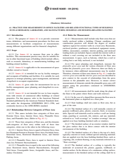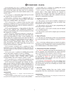 SIGNIFICANCE AND USE 4.1 This practice can be used to facilitate comparison of areas that have been measured but it does not specify what measurements must be conducted. 4.2 This practice can be used in space programming and forecasting of space requirements. 4.3 This practice can be used to classify areas for internal cost accounting purposes. 4.4 This practice can be used to compare space use between organizations. SCOPE 1.1 This practice provides a definitive procedure for measuring and classifying floor area in buildings for use in facility management, specifying occupant requirements, space planning, and for strategic facility planning. 1.2 This practice specifies the sequence in which to measure floor area. 1.3 This practice is applicable to owned, rented, and leased buildings. 1.4 Use Annex A1 to measure floor area in office facilities. The measurement practice in Annex A1 may also be suitable for use in other functional types of building which include offices, such as research, laboratory, or manufacturing buildings and building-related facilities. 1.5 The practice in Annex A1 is not intended for use in lease negotiations with owners of commercial office buildings or related properties. For that purpose, refer to the American National Standard published by the American National Standards Institute under the designation ANSI/BOMA Z65.1–1996 and commonly known as the ANSI-BOMA standard. 1.6 This practice is not intended for and not suitable for use for regulatory purposes, fire hazard assessment, and fire risk assessment. 1.7 This practice was developed for use within North America and includes some rules comparable to ISO 9836 Performance Standards in Building—Definition and Calculation of Area and Space Indicators. 1.8 The values stated in either SI units or inch-pound units are to be regarded separately as standard. The values stated in each system may not be exact equivalents; therefore, each system shall be used independently of the other. Combining values from the two systems may result in non-conformance with the standard. 1.9 This standard does not purport to address all of the safety concerns, if any, associated with its use. It is the responsibility of the user of this standard to establish appropriate safety and health practices and determine the applicability of regulatory limitations prior to use.