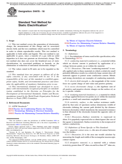 ASTM D4470-18 is a standard published by ASTM International. Its full title is "Standard Test Method for Static Electrification". This standard covers: SIGNIFICANCE AND USE 4.1 Whenever two dissimilar materials are contacted and separated, excess electrostatic charge (triboelectric charge) will be found on these materials if at least one of the materials is a good insulator. This excess charge gives rise to electric fields which can exert forces on other objects. If these fields exceed the breakdown strength of the surrounding gas, a disruptive discharge (spark) can occur. The heat from this discharge can ignite explosive atmospheres, the light can fog photosensitized materials, and the current flowing in a static discharge can cause catastrophic failure of solid state devices. Electric forces can be used beneficially, as in electrostatic copying, spray painting and beneficiation of ores. They can be detrimental as when they attract dirt to a surface or when they cause sheets to stick together. Since most plastic materials in use today have very good insulating qualities, it is difficult to avoid generation of static electricity. Since it depends on many parameters, it is difficult to generate static electricity reliably and reproducibly. SCOPE 1.1 This test method covers the generation of electrostatic charge, the measurement of this charge and its associated electric field, and the test conditions which must be controlled in order to obtain reproducible results. This test method is applicable to both solids and liquids. This test method is not applicable to gases, since a transfer of a gas with no solid impurities in it does not generate an electrostatic charge. This test method also does not cover the beneficial uses of static electrification, its associated problems or hazards, or the elimination or reduction of unwanted electrostatic charge.2 1.2 The values stated in SI units are to be regarded as the standard. 1.3 This standard does not purport to address all of the safety concerns, if any, associated with its use. It is the responsibility of the user of this standard to establish appropriate safety, health, and environmental practices and determine the applicability of regulatory limitations prior to use. 1.4 This international standard was developed in accordance with internationally recognized principles on standardization established in the Decision on Principles for the Development of International Standards, Guides and Recommendations issued by the World Trade Organization Technical Barriers to Trade (TBT) Committee.