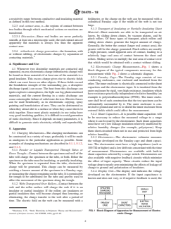 SIGNIFICANCE AND USE 4.1 Whenever two dissimilar materials are contacted and separated, excess electrostatic charge (triboelectric charge) will be found on these materials if at least one of the materials is a good insulator. This excess charge gives rise to electric fields which can exert forces on other objects. If these fields exceed the breakdown strength of the surrounding gas, a disruptive discharge (spark) can occur. The heat from this discharge can ignite explosive atmospheres, the light can fog photosensitized materials, and the current flowing in a static discharge can cause catastrophic failure of solid state devices. Electric forces can be used beneficially, as in electrostatic copying, spray painting and beneficiation of ores. They can be detrimental as when they attract dirt to a surface or when they cause sheets to stick together. Since most plastic materials in use today have very good insulating qualities, it is difficult to avoid generation of static electricity. Since it depends on many parameters, it is difficult to generate static electricity reliably and reproducibly. SCOPE 1.1 This test method covers the generation of electrostatic charge, the measurement of this charge and its associated electric field, and the test conditions which must be controlled in order to obtain reproducible results. This test method is applicable to both solids and liquids. This test method is not applicable to gases, since a transfer of a gas with no solid impurities in it does not generate an electrostatic charge. This test method also does not cover the beneficial uses of static electrification, its associated problems or hazards, or the elimination or reduction of unwanted electrostatic charge.2 1.2 The values stated in SI units are to be regarded as the standard. 1.3 This standard does not purport to address all of the safety concerns, if any, associated with its use. It is the responsibility of the user of this standard to establish appropriate safety, health, and environmental practices and determine the applicability of regulatory limitations prior to use. 1.4 This international standard was developed in accordance with internationally recognized principles on standardization established in the Decision on Principles for the Development of International Standards, Guides and Recommendations issued by the World Trade Organization Technical Barriers to Trade (TBT) Committee.