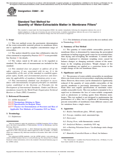ASTM D3861-22 is a standard published by ASTM International. Its full title is "Standard Test Method for Quantity of Water-Extractable Matter in Membrane Filters". This standard covers: SIGNIFICANCE AND USE 5.1 The presence of water-soluble extractables in membrane filters can create errors in test procedures employing membrane filters. However, these errors can be eliminated or significantly reduced if the quantity of water-soluble extractables of the specific membrane is previously determined. Certain membrane filter uses require specifications of maximum water-soluble extractable levels. This test method is intended to be a rapid test to determine the loss of water-soluble compounds such as plasticizers or wetting agents from filtration membranes. This test method is not designed to predetermine the performance of a filter, but is significant in determining the percent extractables of membranes from different sources and lot variations from a single source. SCOPE 1.1 This test method covers the gravimetric determination of the water-extractable material present in membrane filters and is applicable over the complete concentration range of extractables. 1.2 The analyst should be aware that collaborative data for a bias statement as required by Practice D2777 is not provided. See Section 11 for details. 1.3 The values stated in SI units are to be regarded as standard. No other units of measurement are included in this standard. 1.4 This standard does not purport to address all of the safety concerns, if any, associated with its use. It is the responsibility of the user of this standard to establish appropriate safety, health, and environmental practices and determine the applicability of regulatory limitations prior to use. 1.5 This international standard was developed in accordance with internationally recognized principles on standardization established in the Decision on Principles for the Development of International Standards, Guides and Recommendations issued by the World Trade Organization Technical Barriers to Trade (TBT) Committee.