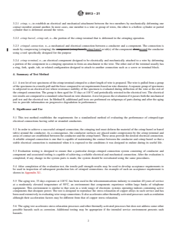 SIGNIFICANCE AND USE 5.1 This test method establishes the requirements for a standardized method of evaluating the performance of crimped-type electrical connections having solid or stranded conductors. 5.2 In order to achieve a successful crimped connection, the crimping tool must deform the material of the crimp barrel or barrel tab(s) around the conductor. As a consequence, the conductor surfaces are placed under compression by the crimp terminal and areas of contact are established between the conductor and the crimp barrel. These areas provide the desired electrical connection. A reliable crimped connection is one that is capable of maintaining the contact between the conductor and crimp barrel so that a stable electrical connection is maintained when it is exposed to the conditions it was designed to endure during its useful life. 5.3 Evaluation testing is designed to ensure that a particular design crimped connection system consisting of conductor and component and associated tooling is capable of achieving a reliable electrical and mechanical connection. After the evaluation is completed, if any change in the system parts is made, the system should be reevaluated using the same procedures. 5.4 After completion of the evaluation test, the tensile pull strength results may be used to develop acceptance requirements to be used in inspection of subsequent production lots of crimped connections. An example of such an acceptance requirement is shown in Appendix X1. 5.5 The aging test, 33 days exposure at 118°C, has been used in the telecommunications industry to simulate 40 years of service at a moderately elevated temperature of 50°C, an environment that components experience within large banks of telephone equipment. This environment is similar to that seen in a wide range of electronic systems operating indoors containing active components that dissipate power. The test is designed to reproduce the stress relaxation of copper alloys in such service and has been used ext... SCOPE 1.1 This test method establishes the requirements for a standardized method of evaluating the quality of crimped-type electrical connections to solid or stranded conductors. This test method applies to 16-gauge and smaller diameter copper wire, coated or uncoated. 1.2 This test method is applicable to connection systems intended for indoor use, or for use in environmentally protected enclosures. Additional testing may be required to assure satisfactory performance in applications where high humidity or corrosive environment, or both, may be present. 1.3 The values stated in SI units are to be regarded as standard. No other units of measurement are included in this standard. 1.4 This standard does not purport to address all of the safety concerns, if any, associated with its use. It is the responsibility of the user of this standard to become familiar with all hazards including those identified in the appropriate Safety Data Sheet (SDS) for this product/material as provided by the manufacturer, to establish appropriate safety, health, and environmental practices, and determine the applicability of regulatory limitations prior to use. 1.5 This international standard was developed in accordance with internationally recognized principles on standardization established in the Decision on Principles for the Development of International Standards, Guides and Recommendations issued by the World Trade Organization Technical Barriers to Trade (TBT) Committee.