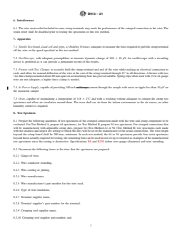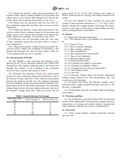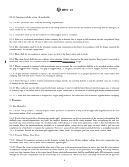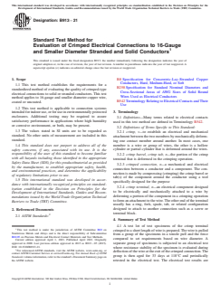 ASTM B913-21 is a standard published by ASTM International. Its full title is "Standard Test Method for Evaluation of Crimped Electrical Connections to 16-Gauge and Smaller Diameter Stranded and Solid Conductors". This standard covers: SIGNIFICANCE AND USE 5.1 This test method establishes the requirements for a standardized method of evaluating the performance of crimped-type electrical connections having solid or stranded conductors. 5.2 In order to achieve a successful crimped connection, the crimping tool must deform the material of the crimp barrel or barrel tab(s) around the conductor. As a consequence, the conductor surfaces are placed under compression by the crimp terminal and areas of contact are established between the conductor and the crimp barrel. These areas provide the desired electrical connection. A reliable crimped connection is one that is capable of maintaining the contact between the conductor and crimp barrel so that a stable electrical connection is maintained when it is exposed to the conditions it was designed to endure during its useful life. 5.3 Evaluation testing is designed to ensure that a particular design crimped connection system consisting of conductor and component and associated tooling is capable of achieving a reliable electrical and mechanical connection. After the evaluation is completed, if any change in the system parts is made, the system should be reevaluated using the same procedures. 5.4 After completion of the evaluation test, the tensile pull strength results may be used to develop acceptance requirements to be used in inspection of subsequent production lots of crimped connections. An example of such an acceptance requirement is shown in Appendix X1. 5.5 The aging test, 33 days exposure at 118°C, has been used in the telecommunications industry to simulate 40 years of service at a moderately elevated temperature of 50°C, an environment that components experience within large banks of telephone equipment. This environment is similar to that seen in a wide range of electronic systems operating indoors containing active components that dissipate power. The test is designed to reproduce the stress relaxation of copper alloys in such service and has been used ext... SCOPE 1.1 This test method establishes the requirements for a standardized method of evaluating the quality of crimped-type electrical connections to solid or stranded conductors. This test method applies to 16-gauge and smaller diameter copper wire, coated or uncoated. 1.2 This test method is applicable to connection systems intended for indoor use, or for use in environmentally protected enclosures. Additional testing may be required to assure satisfactory performance in applications where high humidity or corrosive environment, or both, may be present. 1.3 The values stated in SI units are to be regarded as standard. No other units of measurement are included in this standard. 1.4 This standard does not purport to address all of the safety concerns, if any, associated with its use. It is the responsibility of the user of this standard to become familiar with all hazards including those identified in the appropriate Safety Data Sheet (SDS) for this product/material as provided by the manufacturer, to establish appropriate safety, health, and environmental practices, and determine the applicability of regulatory limitations prior to use. 1.5 This international standard was developed in accordance with internationally recognized principles on standardization established in the Decision on Principles for the Development of International Standards, Guides and Recommendations issued by the World Trade Organization Technical Barriers to Trade (TBT) Committee.