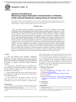 SIGNIFICANCE AND USE 4.1 The purpose of these test methods is to provide reliable and repeatable tests for the evaluation of various types of protective headgear when subjected to rotational loading. Use of these test methods in conjunction with the specific individual performance standards is intended to reduce the likelihood of serious injury and death resulting from impacts to the head sustained by individuals participating in sports, recreation, and other leisure activities in which protective headgear is worn. SCOPE 1.1 This test method covers laboratory equipment, procedures, and basic requirements pertinent to testing the performance of helmets during rotational loading using an incline anvil. Deviations and additions to this test method will be specified, as required, in individual ASTM performance standards. 1.2 Requirements—The helmet may be tested under one or more specified environmental conditions for impact attenuation (the limiting of impact forces) as a result of a vertical free-fall onto an incline anvil. 1.3 Except where noted, the values stated in SI units are to be regarded as the standard. The values given in parentheses are for information only. 1.4 This standard does not purport to address all of the safety concerns, if any, associated with its use. It is the responsibility of the user of this standard to establish appropriate safety, health, and environmental practices and determine the applicability of regulatory limitations prior to use. 1.5 This international standard was developed in accordance with internationally recognized principles on standardization established in the Decision on Principles for the Development of International Standards, Guides and Recommendations issued by the World Trade Organization Technical Barriers to Trade (TBT) Committee.
