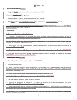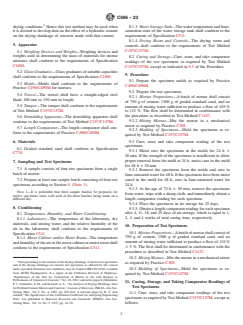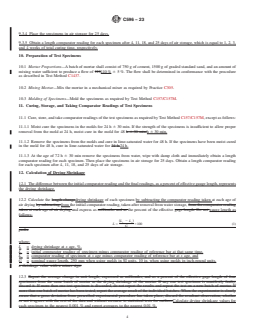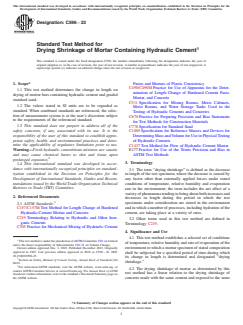 ASTM C596-23 is a standard published by ASTM International. Its full title is "Standard Test Method for Drying Shrinkage of Mortar Containing Hydraulic Cement". This standard covers: SIGNIFICANCE AND USE 4.1 This test method establishes a selected set of conditions of temperature, relative humidity and rate of evaporation of the environment to which a mortar specimen of stated composition shall be subjected for a specified period of time during which its change in length is determined and designated “drying shrinkage.” 4.2 The drying shrinkage of mortar as determined by this test method has a linear relation to the drying shrinkage of concrete made with the same cement and exposed to the same drying conditions.4 Hence this test method may be used when it is desired to develop data on the effect of a hydraulic cement on the drying shrinkage of concrete made with that cement. SCOPE 1.1 This test method determines the change in length on drying of mortar bars containing hydraulic cement and graded standard sand. 1.2 The values stated in SI units are to be regarded as standard. When combined standards are referenced, the selection of measurement system is at the user’s discretion subject to the requirements of the referenced standard. 1.3 This standard does not purport to address all of the safety concerns, if any, associated with its use. It is the responsibility of the user of this standard to establish appropriate safety, health, and environmental practices and determine the applicability of regulatory limitations prior to use. Warning—Fresh hydraulic cementitious mixtures are caustic and may cause chemical burns to skin and tissue upon prolonged exposure).2 1.4 This international standard was developed in accordance with internationally recognized principles on standardization established in the Decision on Principles for the Development of International Standards, Guides and Recommendations issued by the World Trade Organization Technical Barriers to Trade (TBT) Committee.