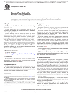 SIGNIFICANCE AND USE 4.1 The complex stress and strain conditions that occur in the sample during the torsion test are sensitive to minor variations in materials, making the torsion test a useful tool in assessing wire ductility under torsional loading. SCOPE 1.1 This test method describes the torsion (or twist) testing of metallic wire. 1.2 The values stated in U.S. customary units are to be regarded as the standard. The SI equivalents of U.S. customary units may be approximate. 1.3 This standard does not purport to address all of the safety concerns, if any, associated with its use. It is the responsibility of the user of this standard to establish appropriate safety, health, and environmental practices and determine the applicability of regulatory limitations prior to use. 1.4 This international standard was developed in accordance with internationally recognized principles on standardization established in the Decision on Principles for the Development of International Standards, Guides and Recommendations issued by the World Trade Organization Technical Barriers to Trade (TBT) Committee.
