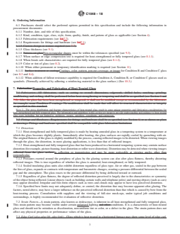ABSTRACT This specification covers heat-treated flat glass - kind HS, kind FT coated and uncoated glass used in general building construction. Glass furnished under this specification shall be of the following conditions: condition A - uncoated surfaces, condition B - spandrel glass, one surface ceramic coated, and condition C - other coated glass. Flat glass furnished under this specification shall be of the following kinds: kind HS - heat-strengthened glass shall be flat glass, either transparent or patterned, in accordance with the applicable requirements, and kind FT - fully tempered glass shall be flat glass, either transparent or patterned in accordance with the applicable requirements. All fabrication, such as cutting to overall dimensions, edgework, drilled holes, notching, grinding, sandblasting, and etching, shall be performed before strengthening or tempering and shall be as specified. Requirements for fittings and hardware shall be as specified. In heat-strengthened and fully tempered glass, a strain pattern, which is not normally visible, may become visible under certain light conditions. The support system and the amount of glass deflection for a given set of wind-load conditions must be considered for design purposes. Heat-treated flat glass cannot be cut after tempering. Heat-treated glass can be furnished with holes, notches, cutouts, and bevels. The expansion fit and porosity of the ceramic coating shall be tested to meet the requirements prescribed. Specimens for evaluation of resistance to alkali and acid shall be prepared and tested to meet the requirements prescribed. SCOPE 1.1 This specification covers the requirements for monolithic flat heat-strengthened and fully tempered coated and uncoated glass produced on a horizontal tempering system used in general building construction and other applications. 1.2 This specification does not address bent glass, or heat-strengthened or fully tempered glass manufactured on a vertical tempering system. 1.3 The dimensional values stated in SI units are to be regarded as the standard. The units given in parentheses are for information only. 1.4 The following safety hazards caveat pertains only to the test method portion, Section 10, of this specification: This standard does not purport to address all of the safety concerns, if any, associated with its use. It is the responsibility of the user of this standard to establish appropriate safety, health, and environmental practices and determine the applicability of regulatory limitations prior to use. 1.5 This international standard was developed in accordance with internationally recognized principles on standardization established in the Decision on Principles for the Development of International Standards, Guides and Recommendations issued by the World Trade Organization Technical Barriers to Trade (TBT) Committee.