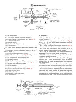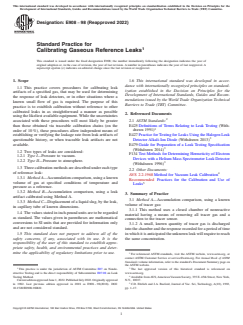 ASTM E908-98(2022) is a standard published by ASTM International. Its full title is "Standard Practice for Calibrating Gaseous Reference Leaks". This standard covers: ABSTRACT This practice establishes the standard procedures for calibrating leak artifacts of a specified gas, that may be used for determining the response of leak detectors, or in other situations where a known small flow of gas is required. The purpose of this practice is to establish calibration without reference to other calibrated leaks in as straightforward a manner as possible using the likeliest available equipment. The two types of leaks considered here are Type I, which is pressure to vacuum, and Type II, which is pressure to atmosphere. Three calibration methods are described under each type of reference leak, as follows: Method A—accumulation comparison using a known volume of tracer gas at specified conditions of temperature and pressure as a reference; Method B—accumulation comparison using a reference leak artifact calibrated using Method A; and Method C—direct measurement of leak rate by timing the movement (displacement) of a liquid slug, by the leak, in a capillary tube of known dimensions. SCOPE 1.1 This practice covers procedures for calibrating leak artifacts of a specified gas, that may be used for determining the response of leak detectors, or in other situations where a known small flow of gas is required. The purpose of this practice is to establish calibration without reference to other calibrated leaks in as straightforward a manner as possible using the likeliest available equipment. While the uncertainties associated with these procedures will most likely be greater than those obtained via traceable calibration chains (on the order of 10 %), these procedures allow independent means of establishing or verifying the leakage rate from leak artifacts of questionable history, or when traceable leak artifacts are not available. 1.2 Two types of leaks are considered: 1.2.1 Type I—Pressure to vacuum. 1.2.2 Type II—Pressure to atmosphere. 1.3 Three calibration methods are described under each type of reference leak: 1.3.1 Method A—Accumulation comparison, using a known volume of gas at specified conditions of temperature and pressure as a reference. 1.3.2 Method B—Accumulation comparison, using a leak artifact calibrated using Method A. 1.3.3 Method C—Displacement of a liquid slug, by the leak, in capillary tube of known dimensions. 1.4 The values stated in inch-pound units are to be regarded as standard. The values given in parentheses are mathematical conversions to SI units that are provided for information only and are not considered standard. 1.5 This standard does not purport to address all of the safety concerns, if any, associated with its use. It is the responsibility of the user of this standard to establish appropriate safety, health, and environmental practices and determine the applicability of regulatory limitations prior to use. 1.6 This international standard was developed in accordance with internationally recognized principles on standardization established in the Decision on Principles for the Development of International Standards, Guides and Recommendations issued by the World Trade Organization Technical Barriers to Trade (TBT) Committee.