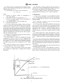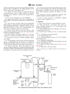 ABSTRACT This practice establishes the standard procedures for calibrating leak artifacts of a specified gas, that may be used for determining the response of leak detectors, or in other situations where a known small flow of gas is required. The purpose of this practice is to establish calibration without reference to other calibrated leaks in as straightforward a manner as possible using the likeliest available equipment. The two types of leaks considered here are Type I, which is pressure to vacuum, and Type II, which is pressure to atmosphere. Three calibration methods are described under each type of reference leak, as follows: Method A—accumulation comparison using a known volume of tracer gas at specified conditions of temperature and pressure as a reference; Method B—accumulation comparison using a reference leak artifact calibrated using Method A; and Method C—direct measurement of leak rate by timing the movement (displacement) of a liquid slug, by the leak, in a capillary tube of known dimensions. SCOPE 1.1 This practice covers procedures for calibrating leak artifacts of a specified gas, that may be used for determining the response of leak detectors, or in other situations where a known small flow of gas is required. The purpose of this practice is to establish calibration without reference to other calibrated leaks in as straightforward a manner as possible using the likeliest available equipment. While the uncertainties associated with these procedures will most likely be greater than those obtained via traceable calibration chains (on the order of 10 %), these procedures allow independent means of establishing or verifying the leakage rate from leak artifacts of questionable history, or when traceable leak artifacts are not available. 1.2 Two types of leaks are considered: 1.2.1 Type I—Pressure to vacuum. 1.2.2 Type II—Pressure to atmosphere. 1.3 Three calibration methods are described under each type of reference leak: 1.3.1 Method A—Accumulation comparison, using a known volume of gas at specified conditions of temperature and pressure as a reference. 1.3.2 Method B—Accumulation comparison, using a leak artifact calibrated using Method A. 1.3.3 Method C—Displacement of a liquid slug, by the leak, in capillary tube of known dimensions. 1.4 The values stated in inch-pound units are to be regarded as standard. The values given in parentheses are mathematical conversions to SI units that are provided for information only and are not considered standard. 1.5 This standard does not purport to address all of the safety concerns, if any, associated with its use. It is the responsibility of the user of this standard to establish appropriate safety, health, and environmental practices and determine the applicability of regulatory limitations prior to use. 1.6 This international standard was developed in accordance with internationally recognized principles on standardization established in the Decision on Principles for the Development of International Standards, Guides and Recommendations issued by the World Trade Organization Technical Barriers to Trade (TBT) Committee.