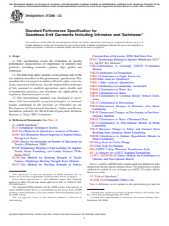 ASTM D7268-23 is a technical specification published by ASTM International. Its full title is "Standard Performance Specification for Seamless Knit Garments Including Intimates and Swimwear". This standard covers: ABSTRACT This specification covers the evaluation of specific performance characteristics of importance in seamless knit garments, including camisoles, panties, slips, girdles and swimwear. Different tests shall be conducted in order to determine the following properties of seamless knit garments: bursting strength, colorfastness to laundering, colorfastness to drycleaning, colorfastness to crocking, colorfastness to light, colorfastness to perspiration, colorfastness to intimates, colorfastness to sea water, colorfastness to chlorinated pool water, colorfastness to chlorine and non-chlorine bleach, dimensional change, stretch, flammability, garnet twist, and fiber content. SIGNIFICANCE AND USE 4.1 Upon mutual agreement between the purchaser and the supplier, seamless knit garments intended for this end use should meet all of the requirements listed in Table 1 of this specification. (A) See Note 4. 4.2 It is recognized that, for purposes of fashion or aesthetics, the ultimate consumer of articles made from these fabrics may find acceptable products that do not conform to all of the requirements listed in Table 1. Therefore, one or more of the requirements in Table 1 may be modified by mutual agreement between the purchaser and the supplier. 4.2.1 In such cases, any references to the specifications should specify that: “This product meets ASTM specifications XXXX except for the following characteristic(s).” 4.3 Where no pre-purchase agreement has been reached between the purchaser and supplier, and in case of controversy, the requirements listed in Table 1 are intended to be used as a guide only. As noted in 4.2, ultimate consumer demands dictate varying performance parameters for a particular product. 4.4 The uses and significance of particular properties and test methods are discussed in the appropriate sections of the specified test methods. SCOPE 1.1 This specification covers the evaluation of specific performance characteristics of importance in seamless knit garments, including camisoles, panties, slips, girdles and swimwear. 1.2 The following safety hazards caveat pertains only to the test methods described in this performance specification: This standard does not purport to address all of the safety concerns, if any, associated with its use. It is the responsibility of the user of this standard to establish appropriate safety, health, and environmental practices and determine the applicability of regulatory limitations prior to use. 1.3 This international standard was developed in accordance with internationally recognized principles on standardization established in the Decision on Principles for the Development of International Standards, Guides and Recommendations issued by the World Trade Organization Technical Barriers to Trade (TBT) Committee.