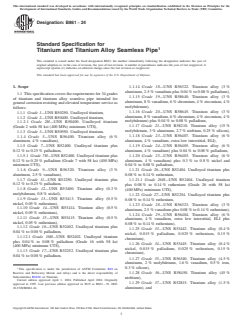 1.1 This specification covers the requirements for 34 grades of titanium and titanium alloy seamless pipe intended for general corrosion resisting and elevated temperature service as follows: