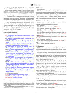 ASTM B861-24 is a technical specification published by ASTM International. Its full title is "Standard Specification for Titanium and Titanium Alloy Seamless Pipe". This standard covers: ABSTRACT This specification covers the requirements for 34 grades of titanium and titanium alloy seamless pipe intended for general corrosion resisting and elevated temperature service. Alloys may be supplied in the following conditions: Grades 5, 23, 24, 25, 29, 35, or 36 – annealed or aged; Grades 9, 18, 28, or 38 – cold-worked and stress-relieved or annealed; Grades 9, 18, 23, 28, or 29 – transformed-beta condition; and Grades 19, 20, or 21 – solution-treated or solution-treated and aged. The grades shall conform to the required chemical composition for nitrogen, carbon, hydrogen, iron, oxygen, aluminum, vanadium, tin, ruthenium, palladium, chromium, nickel, niobium, zirconium, silicon, and titanium. Chemical analysis and product analysis shall be performed. Mechanical requirements shall conform to the required room temperature values for tensile strength, yield strength, and elongation. The following shall also be performed: tension, flattening, bend, and hydrostatic tests. SCOPE 1.1 This specification covers the requirements for 34 grades of titanium and titanium alloy seamless pipe intended for general corrosion resisting and elevated temperature service as follows: 1.1.1 Grade 1—UNS R50250. Unalloyed titanium, 1.1.2 Grade 2—UNS R50400. Unalloyed titanium, 1.1.2.1 Grade 2H—UNS R50400. Unalloyed titanium (Grade 2 with 58 ksi (400 MPa) minimum UTS), 1.1.3 Grade 3—UNS R50550. Unalloyed titanium, 1.1.4 Grade 5—UNS R56400. Titanium alloy (6 % aluminum, 4 % vanadium), 1.1.5 Grade 7—UNS R52400. Unalloyed titanium plus 0.12 % to 0.25 % palladium, 1.1.5.1 Grade 7H—UNS R52400. Unalloyed titanium plus 0.12 % to 0.25 % palladium (Grade 7 with 58 ksi (400 MPa) minimum UTS), 1.1.6 Grade 9—UNS R56320. Titanium alloy (3 % aluminum, 2.5 % vanadium), 1.1.7 Grade 11—UNS R52250. Unalloyed titanium plus 0.12 % to 0.25 % palladium, 1.1.8 Grade 12—UNS R53400. Titanium alloy (0.3 % molybdenum, 0.8 % nickel), 1.1.9 Grade 13—UNS R53413. Titanium alloy (0.5 % nickel, 0.05 % ruthenium), 1.1.10 Grade 14—UNS R53414. Titanium alloy (0.5 % nickel, 0.05 % ruthenium), 1.1.11 Grade 15—UNS R53415. Titanium alloy (0.5 % nickel, 0.05 % ruthenium), 1.1.12 Grade 16—UNS R52402. Unalloyed titanium plus 0.04 % to 0.08 % palladium, 1.1.12.1 Grade 16H—UNS R52402. Unalloyed titanium plus 0.04 % to 0.08 % palladium (Grade 16 with 58 ksi (400 MPa) minimum UTS), 1.1.13 Grade 17—UNS R52252. Unalloyed titanium plus 0.04 % to 0.08 % palladium, 1.1.14 Grade 18—UNS R56322. Titanium alloy (3 % aluminum, 2.5 % vanadium plus 0.04 % to 0.08 % palladium), 1.1.15 Grade 19—UNS R58640. Titanium alloy (3 % aluminum, 8 % vanadium, 6 % chromium, 4 % zirconium, 4 % molybdenum), 1.1.16 Grade 20—UNS R58645. Titanium alloy (3 % aluminum, 8 % vanadium, 6 % chromium, 4 % zirconium, 4 % molybdenum) plus 0.04 % to 0.08 % palladium, 1.1.17 Grade 21—UNS R58210. Titanium alloy (15 % molybdenum, 3 % aluminum, 2.7 % niobium, 0.25 % silicon), 1.1.18 Grade 23—UNS R56407. Titanium alloy (6 % aluminum, 4 % vanadium, extra low interstitial, ELI), 1.1.19 Grade 24—UNS R56405. Titanium alloy (6 % aluminum, 4 % vanadium) plus 0.04 % to 0.08 % palladium, 1.1.20 Grade 25—UNS R56403. Titanium alloy (6 % aluminum, 4 % vanadium) plus 0.3 % to 0.8 % nickel and 0.04 % to 0.08 % palladium, 1.1.21 Grade 26—UNS R52404. Unalloyed titanium plus 0.08 % to 0.14 % ruthenium, 1.1.21.1 Grade 26H—UNS R52404. Unalloyed titanium plus 0.08 % to 0.14 % ruthenium (Grade 26 with 58 ksi (400 MPa) minimum UTS), 1.1.22 Grade 27—UNS R52254. Unalloyed titanium plus 0.08 % to 0.14 % ruthenium, 1.1.23 Grade 28—UNS R56323. Titanium alloy (3 % aluminum, 2.5 % vanadium plus 0.08 % to 0.14 % ruthenium), 1.1.24 Grade 29—UNS R56404. Titanium alloy (6 % aluminum, 4 % vanadium, extra low interstitial, ELI plus 0.08 % to 0.14 % ruthenium), 1.1.25 Grade 33—UNS R53442. Titanium alloy (0.4 % nickel, 0.015 % palladium, 0.025 % ruthenium, 0.15 % chromium...