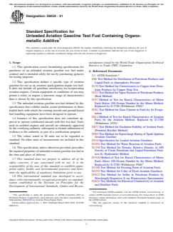 ASTM D8434-21 is a technical specification published by ASTM International. Its full title is "Standard Specification for Unleaded Aviation Gasoline Test Fuel Containing Organo-metallic Additive". This standard covers: SCOPE 1.1 This specification covers formulating specifications for purchases of an unleaded aviation gasoline test fuel under contract and is intended solely for use by purchasing agencies for testing purposes. 1.2 This specification defines a specific type of aviation gasoline for use as an aviation spark-ignition engine test fuel. It does not include all gasolines satisfactory for reciprocating aviation engines. Certain equipment or conditions of use may permit a wider, or require a narrower, range of characteristics than is shown by this specification. 1.3 The unleaded aviation gasoline test fuel defined by this specification does exhibit similar octane performance to those leaded fuels with which the existing aircraft and ground-based fuel handling equipment have been designed to operate. 1.4 Issuance of this specification does not constitute approval to operate certificated aircraft with this test fuel. Fuels used in certified engines and aircraft are ultimately approved by the certifying authority subsequent to formal submission of evidence to the authority as part of a certification program. 1.5 The values stated in SI units are to be regarded as standard. No other units of measurement are included in this standard. 1.6 This specification, unless otherwise provided, prescribes the required properties of unleaded aviation gasoline test fuel at the time and place of delivery. 1.7 This standard does not purport to address all of the safety concerns, if any, associated with its use. It is the responsibility of the user of this standard to establish appropriate safety, health, and environmental practices and determine the applicability of regulatory limitations prior to use. 1.8 This international standard was developed in accordance with internationally recognized principles on standardization established in the Decision on Principles for the Development of International Standards, Guides and Recommendations issued by the World Trade Organization Technical Barriers to Trade (TBT) Committee.