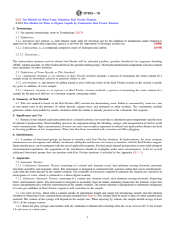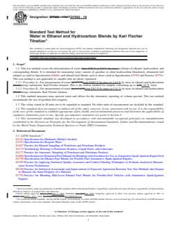 SIGNIFICANCE AND USE 5.1 Blends of fuel ethanol and hydrocarbon have a limited solvency for water that is dependent upon temperature and the ratio of ethanol to hydrocarbon. Good handling practices are important during the blending, storage, and transportation of fuel to avoid water contamination. High concentrations of water can cause haze or phase separation in ethanol and hydrocarbon blends and lead to freezing problems at low temperatures. Water has also been associated with corrosion and filter plugging. SCOPE 1.1 This test method covers the determination of water in blends of ethanol, hydrocarbon, and corresponding blends. It is intended for measuring water content of gasoline or other hydrocarbon blendstock, denatured fuel ethanol as cited in Specification D4806, and ethanol fuel blends such as those cited in Specification D5798 and Practice D7794. This test method is not applicable to samples that are phase separated. 1.1.1 Procedure A—For measurement of water from 0.004 % by mass to 1.63 % by mass in ethanol and hydrocarbon using coulometric Karl Fischer titration. This is the referee method for samples containing up to 1.63 % water. 1.1.2 Procedure B—For measurement of water from 0.02 % by mass to 5.41 % by mass in ethanol and hydrocarbon using volumetric Karl Fischer titration. 1.2 This method measures mass percent water and allows for the alternative reporting of volume percent. This test method recommends the use of pyridine-free reagents. 1.3 The values stated in SI units are to be regarded as standard. No other units of measurement are included in this standard. 1.4 This standard does not purport to address all of the safety concerns, if any, associated with its use. It is the responsibility of the user of this standard to establish appropriate safety, health, and environmental practices and determine the applicability of regulatory limitations prior to use. Specific precautionary statements are given in Section 8. 1.5 This international standard was developed in accordance with internationally recognized principles on standardization established in the Decision on Principles for the Development of International Standards, Guides and Recommendations issued by the World Trade Organization Technical Barriers to Trade (TBT) Committee.