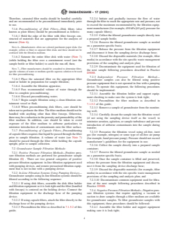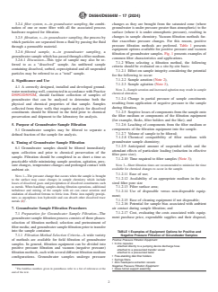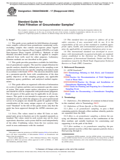 SIGNIFICANCE AND USE 4.1 A correctly designed, installed and developed groundwater monitoring well, constructed in accordance with Practice D5092/D5092M, should facilitate collection of samples of groundwater that can be analyzed to determine both the physical and chemical properties of that sample. Samples collected from these wells that require analysis for dissolved constituents should be filtered in the field prior to chemical preservation and shipment to the laboratory for analysis. SCOPE 1.1 This guide covers methods for field filtration of groundwater samples collected from groundwater monitoring wells, excluding samples that contain non-aqueous phase liquids (either Dense Non-Aqueous Phase Liquids (DNAPLs) or Light Non-Aqueous Phase Liquids (LNAPLs)). Methods of field filtration described herein could also be applied to samples collected from wells used for other purposes. Laboratory filtration methods are not described in this guide. 1.2 This guide provides procedures available for field filtration of groundwater samples. The need for sample filtration for specific analytes should be defined prior to the sampling event and documented in the site-specific sampling and analysis plan in accordance with Guide D5903. The decision should be made on a parameter-specific basis with consideration of the data quality objectives of the sampling program, any applicable regulatory agency guidelines, and analytical method requirements. 1.3 This guide offers an organized collection of information or a series of options and does not recommend a specific course of action. This guide cannot replace education or experience and should be used in conjunction with professional judgment. Not all aspects of this guide may be applicable in all circumstances. This guide is not intended to represent or replace the standard of care by which the adequacy of a given professional service to be judged, nor should this guide be applied without consideration of the many unique aspects of a project. The word “Standard” in the title of this guide means only that the guide has been approved through the ASTM consensus process. 1.4 Units—The values stated in either SI Units or inch-pound units given in brackets are to be regarded separately as standard. The values stated in each system may not be exact equivalents; therefore, each system shall be used independently of the other. Combining values from the two systems may result in non-conformance with the standard. 1.5 This standard does not purport to address all of the safety concerns, if any, associated with its use. It is the responsibility of the user of this standard to establish appropriate safety, health, and environmental practices and determine the applicability of regulatory limitations prior to use. 1.6 This international standard was developed in accordance with internationally recognized principles on standardization established in the Decision on Principles for the Development of International Standards, Guides and Recommendations issued by the World Trade Organization Technical Barriers to Trade (TBT) Committee.