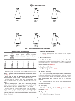 ABSTRACT This specification provides standard dimensional requirements for glass filtering flasks suitable for general laboratory use. Glass filter flasks shall be in the following types: Type I, Type II (Class 1 and Class 2), and Type III (Class 1, Class 2, and Class 3). Flasks shall be made of the specified borosilicate glass and shall conform to the prescribed maximum residual thermal stress. The general appearance of the flasks are illustrated. The design for (1) conical flasks including bottom concavity and bottom heel radius, (2) neck finish, and (3) side-arm are specified. Filtering flasks shall conform to the prescribed requirements for (1) capacity; (2) dimensions such as body outside diameter, overall height, rubber stopper size, bottom and heel wall thickness, and base/heel radius; and (4) pressure resistance. Each flask shall be permanently marked with the name or known trademark of the manufacturer and the nominal capacity. There shall be an area on one side of the flask for marking with a pencil. SCOPE 1.1 This specification provides standard dimensional requirements for glass filtering flasks suitable for general laboratory use. 1.2 This international standard was developed in accordance with internationally recognized principles on standardization established in the Decision on Principles for the Development of International Standards, Guides and Recommendations issued by the World Trade Organization Technical Barriers to Trade (TBT) Committee.