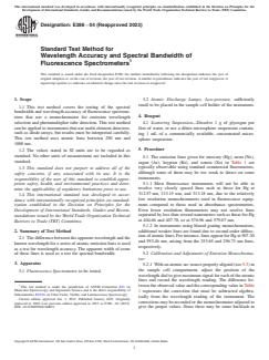 ASTM E388-04(2023) - Standard Test Method for Wavelength Accuracy and Spectral Bandwidth of Fluorescence Spectrometers provides a systematic approach for evaluating the wavelength accuracy and spectral bandwidth of fluorescence spectrometers. This standard is essential for laboratories, instrument manufacturers, and organizations seeking reliable, repeatable performance from fluorescence spectrometers used in molecular spectroscopy and luminescence analyses.