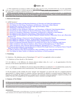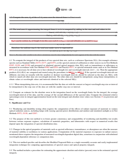 SIGNIFICANCE AND USE 5.1 Weathering and durability testing often requires the computation of the effects of radiant exposure of materials to various optical radiation sources, including lamps with varying spectral power distributions and outdoor and simulated sunlight as in Test Methods E972, G130, and G207. 5.2 The purpose of this test method is to foster greater consistency and comparability of weathering and durability test results between various exposure regimes, calculation of materials properties, and laboratories with respect to numerical results that depend upon the integration of spectral distribution data. 5.3 Changes in the optical properties of materials such as spectral reflectance, transmittance, or absorptance are often the measure of material stability or usefulness in various applications. Computation of the material responses to exposure to radiant sources mentioned above requires the integration of measured wavelength-dependent digital data, sometimes in conjunction with tabulated wavelength-dependent reference or comparison data. 5.4 This test method specifies and describes the Modified Trapezoid Rule as a single reasonably accurate and easily implemented integration technique for computing approximations of spectral source and optical property integrals. 5.5 The method includes a procedure for estimating the approximate absolute and relative (percent) error in the estimated spectral integrals. 5.6 The method includes a procedure to construct data sets that match in spectral wavelength and spectral wavelength interval, which does not have to be uniform over the spectral range of interest. Uniform spectral intervals simplify some of the calculations, but are not required. SCOPE 1.1 This test method specifies a single relatively simple method to implement, common integration technique, the Modified Trapezoid Rule, to integrate digital or tabulated spectral data. The intent is to produce greater consistency and comparability of weathering and durability test results between various exposure regimes, calculation of materials properties, and laboratories with respect to numerical results that depend upon the integration of spectral distribution data. 1.2 Weathering and durability testing often requires the computation of the effects of radiant exposure of materials to various optical radiation sources, including lamps with varying spectral power distributions and outdoor and simulated sunlight. Changes in the spectrally dependent optical properties of materials, in combination with exposure source spectral data, are often used to evaluate the effect of exposure to radiant sources, develop activation spectra (Practice G178), and classify, evaluate, or rate sources with respect to reference or exposure source spectral distributions. Another important application is the integration of the original spectrally dependent optical properties of materials in combination with exposure source spectral data to determine the total energy absorbed by a material from various exposure sources. 1.3 The data applications described in 1.2 often require the use of tabulated reference spectral distributions, digital spectral data produced by modern instrumentation, and the integrated version of that data, or combinations (primarily multiplication) of spectrally dependent data. 1.4 Computation of the material responses to exposure to radiant sources mentioned above require the integration of measured wavelength dependent digital data, sometimes in conjunction with tabulated wavelength dependent reference or comparison data. 1.5 The term “integration” in the previous sections refers to the numerical approximation to the true integral of continuous functions, represented by discrete, digital data. There are numerous mathematical techniques for performing numerical integration. Each method provides different levels of complexity, accuracy, ease of implementation and computational efficiency, an...