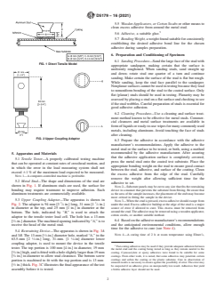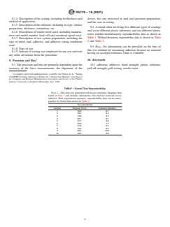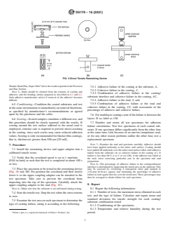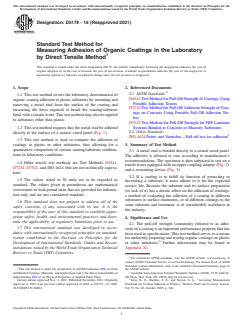 ASTM D5179-16(2021) is a standard published by ASTM International. Its full title is "Standard Test Method for Measuring Adhesion of Organic Coatings in the Laboratory by Direct Tensile Method". This standard covers: SIGNIFICANCE AND USE 4.1 The pull-off strength (commonly referred to as adhesion) of a coating is an important performance property that has been used in specifications. This test method serves as a means for uniformly preparing and testing organic coatings on plastic or other substrates.4 Further information may be found in Appendix X1. SCOPE 1.1 This test method covers the laboratory determination of organic coating adhesion to plastic substrates by mounting and removing a metal stud from the surface of the coating and measuring the force required to break the coating/substrate bond with a tensile tester. This test method may also be applied to substrates other than plastic. 1.2 This test method requires that the metal stud be adhered directly to the surface of a coated, cured panel (Fig. 1). FIG. 1 Direct Tensile Model 1.3 This test method is used to compare the adhesion of coatings to plastic or other substrates, thus allowing for a quantitative comparison of various coating/substrate combinations in laboratory conditions. 1.4 Other tensile test methods are Test Methods D4541, D7234, D7522, and ISO 4624 (but are not technically equivalent). 1.5 The values stated in SI units are to be regarded as standard. The values given in parentheses are mathematical conversions to inch-pound units that are provided for information only and are not considered standard. 1.6 This standard does not purport to address all of the safety concerns, if any, associated with its use. It is the responsibility of the user of this standard to establish appropriate safety, health, and environmental practices and determine the applicability of regulatory limitations prior to use. 1.7 This international standard was developed in accordance with internationally recognized principles on standardization established in the Decision on Principles for the Development of International Standards, Guides and Recommendations issued by the World Trade Organization Technical Barriers to Trade (TBT) Committee.