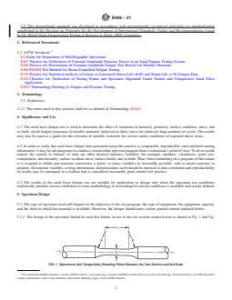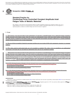 SIGNIFICANCE AND USE 4.1 The axial force fatigue test is used to determine the effect of variations in material, geometry, surface condition, stress, and so forth, on the fatigue resistance of metallic materials subjected to direct stress for relatively large numbers of cycles. The results may also be used as a guide for the selection of metallic materials for service under conditions of repeated direct stress. 4.2 In order to verify that such basic fatigue data generated using this practice is comparable, reproducible, and correlated among laboratories, it may be advantageous to conduct a round-robin-type test program from a statistician's point of view. To do so would require the control or balance of what are often deemed nuisance variables; for example, hardness, cleanliness, grain size, composition, directionality, surface residual stress, surface finish, and so forth. Thus, when embarking on a program of this nature it is essential to define and maintain consistency a priori, as many variables as reasonably possible, with as much economy as prudent. All material variables, testing information, and procedures used should be reported so that correlation and reproducibility of results may be attempted in a fashion that is considered reasonably good current test practice. 4.3 The results of the axial force fatigue test are suitable for application to design only when the specimen test conditions realistically simulate service conditions or some methodology of accounting for service conditions is available and clearly defined. SCOPE 1.1 This practice covers the procedure for the performance of axial force controlled fatigue tests to obtain the fatigue strength of metallic materials in the fatigue regime where the strains are predominately elastic, both upon initial loading and throughout the test. This practice is limited to the fatigue testing of axial unnotched and notched specimens subjected to a constant amplitude, periodic forcing function in air at room temperature. 1.2 The use of this test method is limited to specimens and does not cover testing of full-scale components, structures, or consumer products. 1.3 The values stated in inch-pound units are to be regarded as standard. The values given in parentheses are mathematical conversions to SI units that are provided for information only and are not considered standard. 1.4 The text of this standard references notes and footnotes that provide explanatory material. These notes and footnotes (excluding those in tables and figures) shall not be considered as requirements of the standard. Note 1: The following documents, although not directly referenced in the text, are considered important enough to be listed in this practice: E739 Practice for Statistical Analysis of Linear or Linearized Stress-Life (S-N) and Strain-Life (ε-N) Fatigue Data STP 566 Handbook of Fatigue Testing2 STP 588 Manual on Statistical Planning and Analysis for Fatigue Experiments3 STP 731 Tables for Estimating Median Fatigue Limits4 1.5 This international standard was developed in accordance with internationally recognized principles on standardization established in the Decision on Principles for the Development of International Standards, Guides and Recommendations issued by the World Trade Organization Technical Barriers to Trade (TBT) Committee.