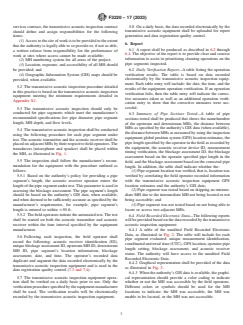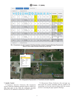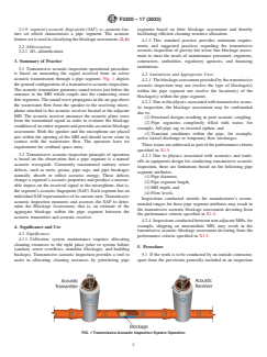 SIGNIFICANCE AND USE 4.1 Significance: 4.1.1 Collection system maintenance requires allocating cleaning resources to the right place prior to system failure (sanitary sewer overflows, mainline blockages, and building backups). Transmissive acoustic inspection provides a tool to assist in allocating cleaning resources by prioritizing pipe segments based on their blockage assessment and thereby facilitating efficient cleaning resource allocation. 4.1.2 This standard practice provides minimum requirements and suggested practices regarding the transmissive acoustic inspection of gravity-fed sewer line blockage assessment to meet the needs of maintenance personnel, engineers, contractors, authorities, regulatory agencies, and financing institutions. 4.2 Limitations and Appropriate Uses: 4.2.1 The blockage assessment provided by the transmissive acoustic inspection may not resolve the type of blockage(s) within the pipe segment nor resolve the location(s) of the blockage(s) within the pipe segment. 4.2.2 Due to the physics associated with transmissive acoustic inspection, the blockage assessment may be confounded due to: (1) Structural designs resulting in poor acoustic coupling, (2) Pipe segments completely filled with water, for example, full pipe sag or inverted siphon, and (3) Transient conditions within the pipe, for example, active lateral discharge or temporary flow surcharges. These issues are addressed as part of the performance criteria specified in X1.5. 4.2.3 Due to physics associated with acoustics and trade-offs in equipment design for conducting transmissive acoustic inspection, there are limitations based on the following pipe segment attributes: (1) Pipe diameter, (2) Pipe segment length, (3) MH depth, and (4) Flow levels. Inspections conducted outside the manufacturer’s recommended ranges for these pipe segment attributes may result in the transmissive acoustic blockage assessment deviating from the performance criteria specified in X1.5... SCOPE 1.1 This practice covers procedures for assessing the blockage within gravity-fed sewer pipes using transmissive acoustics for the purpose of prioritizing sewer pipe cleaning operations.2 The assessment is based on an acoustic receiver measuring the acoustic plane wave transmitted through the pipe segment under test in order to evaluate the blockage condition of an entire segment and to provide an onsite assessment of the blockage within the pipe segment. (1, 2, 3, 4, 5)3 1.2 The scope of this practice covers the use of the transmissive acoustic inspection as a screening tool. The blockage assessment provided by the acoustic inspection should be used to identify and prioritize pipe segments requiring further maintenance action such as cleaning or visual inspection, or both. Thereby, also identifying the pipe segments which are sufficiently clean and do not require additional maintenance action. 1.3 This standard practice does not address structural issues with the pipe wall. 1.4 The inspection process requires access to the manhole (MH) from ground level. It does not require physical access to the sewer line by either the equipment or the operator. 1.5 This standard practice applies to all types of pipe material. 1.6 The inspection process requires access to sewers and operations along roadways or other locations that are safety hazards. This standard does not describe the hazards likely to be encountered or the safety procedures that must be carried out when operating in these hazardous environments. 1.7 The values stated in inch-pound units are to be regarded as standard. The values given in parentheses are mathematical conversions to SI units that are provided for information only and are not considered standard. 1.8 This standard does not purport to address all of the safety concerns, if any, associated with its use. It is the responsibility of the user of this standard to establish appropriate s...