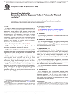 ASTM C488-16(2023) is a standard published by ASTM International. Its full title is "Standard Test Method for Conducting Exterior Exposure Tests of Finishes for Thermal Insulation". This standard covers: SIGNIFICANCE AND USE 5.1 Both physical and chemical changes possibly occur from weather exposure, and these changes affect performance properties, service life, and maintenance schedules. For this reason, tests of properties relating to performance shall be made both before and after specific periods of outdoor exposure. 5.2 This test method recognizes that differing geographical locations, environmental conditions, differences between surface temperatures and ambient temperatures, and test durations have extremely varied effects upon the test results. 5.3 This test method is to be used for comparative qualitative testing. SCOPE 1.1 This test method covers out-of-doors exposure testing of finishes that are normally field-applied to thermal insulation and possibly include joints or joint sealants, or both. Such exposure is essential prior to the determination of certain physical properties when the finish is to be exposed to exterior weather conditions. This test method also indicates possible compatibility problems between the joint sealant and the finish as well as the ability of the finish to span a dry joint. This test method is not intended to evaluate mildew resistance, efflorescence, or chemical resistance. Note 1: For testing free plastic films, see Practice D1435. 1.2 This test method does not prescribe the method of application, test duration, or inspection intervals. 1.3 The values stated in inch-pound units are to be regarded as standard. The values given in parentheses are mathematical conversions to SI units that are provided for information only and are not considered standard. 1.4 This standard does not purport to address all of the safety concerns, if any, associated with its use. It is the responsibility of the user of this standard to establish appropriate safety, health, and environmental practices and determine the applicability of regulatory limitations prior to use. 1.5 This international standard was developed in accordance with internationally recognized principles on standardization established in the Decision on Principles for the Development of International Standards, Guides and Recommendations issued by the World Trade Organization Technical Barriers to Trade (TBT) Committee.
