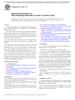 ASTM E1792-24 is a technical specification published by ASTM International. Its full title is "Standard Specification for Wipe Sampling Materials for Lead in Surface Dust". This standard covers: ABSTRACT This specification covers requirements for wipe sampling materials that are used to collect settled dusts on surfaces for the subsequent determination of lead. The wipes shall be tested for conformance to background lead, lead recoverability, collection efficiency, ruggedness which shall be determined using butted vinyl-composite floor tiles as a test surface, moisture content, coefficient of variation in mass, linear dimensions such as mean area and mean length, and mean thickness requirements. SCOPE 1.1 This specification covers requirements for wipes that are used to collect settled dusts on surfaces for the subsequent determination of lead. 1.2 For wipe materials used for the determination of beryllium in surface dust refer to Specification D7707. This is mentioned to insure that users of wipes recognize that there is some relationship between the analytical backgrounds found in wipes and the analyte of interest. 1.3 The values stated in SI units are to be regarded as standard. No other units of measurement are included in this standard. 1.4 This standard does not purport to address all of the safety concerns, if any, associated with its use. It is the responsibility of the user of this standard to establish appropriate safety, health, and environmental practices and determine the applicability of regulatory limitations prior to use. 1.5 This international standard was developed in accordance with internationally recognized principles on standardization established in the Decision on Principles for the Development of International Standards, Guides and Recommendations issued by the World Trade Organization Technical Barriers to Trade (TBT) Committee.