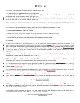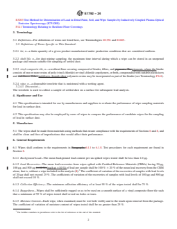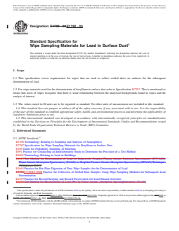 ABSTRACT This specification covers requirements for wipe sampling materials that are used to collect settled dusts on surfaces for the subsequent determination of lead. The wipes shall be tested for conformance to background lead, lead recoverability, collection efficiency, ruggedness which shall be determined using butted vinyl-composite floor tiles as a test surface, moisture content, coefficient of variation in mass, linear dimensions such as mean area and mean length, and mean thickness requirements. SCOPE 1.1 This specification covers requirements for wipes that are used to collect settled dusts on surfaces for the subsequent determination of lead. 1.2 For wipe materials used for the determination of beryllium in surface dust refer to Specification D7707. This is mentioned to insure that users of wipes recognize that there is some relationship between the analytical backgrounds found in wipes and the analyte of interest. 1.3 The values stated in SI units are to be regarded as standard. No other units of measurement are included in this standard. 1.4 This standard does not purport to address all of the safety concerns, if any, associated with its use. It is the responsibility of the user of this standard to establish appropriate safety, health, and environmental practices and determine the applicability of regulatory limitations prior to use. 1.5 This international standard was developed in accordance with internationally recognized principles on standardization established in the Decision on Principles for the Development of International Standards, Guides and Recommendations issued by the World Trade Organization Technical Barriers to Trade (TBT) Committee.