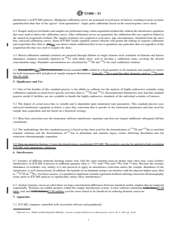 SIGNIFICANCE AND USE 5.1 One of the benefits of this standard practice is the ability to calibrate for the analysis of highly radioactive actinides using calibration standards at much lower specific activities (that is, 232Th and 238U). Environmental laboratories may find this standard practice useful if facilities are not available to handle the highly radioactive standards of the individual actinides of interest. 5.2 The degree of actual mass bias is variable and is dependent upon instrument tune parameters. This standard practice uses universal interference equations to derive a mass bias correction that is specific to the instrument parameters and tune used for sample data acquisition and not based on a historical average. 5.3 Mass bias correction uses the instrument software interference equations and does not require additional subsequent off-line calculations. 5.4 The methodology that this standard practice is based on has been used for the determination of 232Th and 237Np in enriched uranium solutions and the determination of 241Am in plutonium and uranium legacy oxides following dissolution and ion extraction chromatography separation. 5.5 Data presented in Section 12 were developed using a quadrupole ICP-MS. This practice can also be applied to high resolution ICP-MS with appropriate validation. SCOPE 1.1 This practice provides guidance for an alternate linear calibration for the determination of selected actinide isotopes in appropriately prepared aqueous solutions by Inductively Coupled Plasma-Mass Spectrometry (ICP-MS). This alternate calibration is mass bias adjusted using thorium-232 (232Th) and uranium-238 (238U) standards. One of the benefits of this standard practice is the ability to calibrate for the analysis of highly radioactive actinides using calibration standards at much lower specific activities. Environmental laboratories may find this standard practice useful if facilities are not available to handle the highly radioactive standards of the individual actinides of interest. 1.2 The instrument response for a series of determinations of known concentration of 232Th and 238U defines the mass versus response relationship. For each standard concentration, the slope of the line defined by 232Th and 238U is used to derive linear calibration curves for each mass of interest using interference equations. The mass bias corrected calibration curves, although generated from interference equations, are specific to the instrument operating parameters and tuning in effect at the time of data acquisition. Because interference equations are part of the normal ICP-MS manufacturer's software package, this calibration methodology is widely applicable. 1.3 For this standard practice, the actinide atomic mass range that has been studied is from AMU 232 to 244. Guidance for an extended range of AMU 228 to 248 is given in this practice. 1.4 Using this practice, analyte concentrations are reported at each AMU and not by element total (that is, 239Pu versus plutonium). 1.5 The values stated in SI units are to be regarded as standard. No other units of measurement are included in this standard. 1.6 This standard does not purport to address all of the safety concerns, if any, associated with its use. It is the responsibility of the user of this standard to establish appropriate safety, health, and environmental practices and determine the applicability of regulatory limitations prior to use. 1.7 This international standard was developed in accordance with internationally recognized principles on standardization established in the Decision on Principles for the Development of International Standards, Guides and Recommendations issued by the World Trade Organization Technical Barriers to Trade (TBT) Committee.