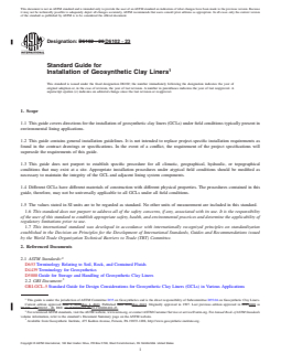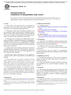 SIGNIFICANCE AND USE 4.1 For optimum performance, GCLs must be installed in a manner that does not impact their physical, mechanical, or hydraulic properties. 4.2 This guide identifies the proper installation procedures and equipment for use by GCL designers, inspectors, and installers. SCOPE 1.1 This guide covers directions for the installation of geosynthetic clay liners (GCLs) under field conditions typically present in environmental lining applications. 1.2 This guide contains general installation guidelines. It is not intended to replace project-specific installation requirements as found in the contract drawings or specifications. In the event of a conflict, the requirement of the project specifications will supersede the requirements of this guide. 1.3 This guide does not purport to establish specific procedure for all climatic, geographical, hydraulic, or topographical conditions that may exist at a site. Appropriate installation procedures under atypical field conditions should be modified as necessary to maintain the integrity of the GCL and adjacent lining system components. 1.4 Different GCLs have different materials of construction with different physical properties. The procedures contained in this guide, therefore, may not be universally applicable to all GCLs under all field conditions. 1.5 The values stated in SI units are to be regarded as standard. No other units of measurement are included in this standard. 1.6 This standard does not purport to address all of the safety concerns, if any, associated with its use. It is the responsibility of the user of this standard to establish appropriate safety, health, and environmental practices and determine the applicability of regulatory limitations prior to use. 1.7 This international standard was developed in accordance with internationally recognized principles on standardization established in the Decision on Principles for the Development of International Standards, Guides and Recommendations issued by the World Trade Organization Technical Barriers to Trade (TBT) Committee.