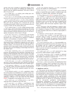 SIGNIFICANCE AND USE 4.1 This practice for the design and installation of groundwater monitoring wells will promote (1) efficient and effective site hydrogeological characterization; (2) durable and reliable well construction; and (3) acquisition of representative groundwater quality samples, groundwater levels, and hydraulic conductivity testing data from monitoring wells. The practices established herein are affected by governmental regulations and by site-specific geological, hydrogeological, climatological, topographical, and subsurface geochemical conditions. To meet these geoenvironmental challenges, this practice promotes the development of a conceptual hydrogeologic model prior to monitoring well design and installation. Note 1: This practice presents a design for monitoring wells that will be effective in the majority of formations. This practice is in general accordance with other national and state guidance documents on well construction (ANSI/NGWA-01-14 (1)4 and California EPA (2)) however; national, state, or local design regulations may control design and installation. 4.2 A properly designed and installed groundwater monitoring well provides essential information on one or more of the following subjects: 4.2.1 Formation geologic and hydraulic properties; 4.2.2 Potentiometric surface of a particular hydrologic unit(s); 4.2.3 Water quality with respect to various indicator parameters; and 4.2.4 Water chemistry with respect to a contaminant release. Note 2: The quality of the result produced by this standard is dependent on the competence of the personnel performing it, and the suitability of the equipment and facilities used. Agencies that meet the criteria of Practice D3740 are generally considered capable of competent and objective testing/sampling/inspection/etc. Users of this standard are cautioned that compliance with Practice D3740 does not in itself assure reliable results. Reliable results depend on many factors; Practice D3740 provides a means of... SCOPE 1.1 This practice describes a methodology for designing and installing conventional (screened and filter-packed) groundwater monitoring wells suitable for formations ranging from unconsolidated aquifers (that is, sands and gravels) to granular materials having grain-size distributions with up to 50 % passing a #200 sieve and as much as 20 % clay-sized material (that is, silty fine sands with some clay). Formations finer than this (that is, silts, clays, silty clays, clayey silts) can be monitored but the well may not yield sufficient water required for sampling, and fine filter pack and screen requirements are difficult and costly to install. Use of coarser filter/screens in fine formations will result in wells with unstable filter packs and associated elevated sample turbidity that may adversely affect sample accuracy and data quality objectives. This practice is not applicable in fractured or karst rock conditions, but may be applicable for other porous rock formations. 1.2 The recommended monitoring well design and installation procedures presented in this practice are based on the assumption that the objectives of the program are to obtain representative groundwater samples and other representative groundwater data from a targeted zone of interest in the subsurface defined by site characterization. 1.3 This practice when used on coarse grained sand and gravel aquifers, in combination with proper well development (D5521), proper groundwater sampling procedures (D4448), and proper well maintenance and rehabilitation (D5978), will permit acquisition of groundwater samples free of artifactual turbidity, eliminate siltation of wells between sampling events, and permit acquisition of accurate groundwater levels and hydraulic conductivity test data from the zone screened by the well. For wells installed in fine-grained formation materials, it is generally necessary to use much finer pre-packed well screens (6.3.3.2) a...