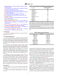 ASTM C833-23 is a technical specification published by ASTM International. Its full title is "Standard Specification for Sintered (Uranium-Plutonium) Dioxide Pellets for Light Water Reactors". This standard covers: ABSTRACT This specification covers finished sintered and ground (uranium-plutonium) dioxide pellets for use in thermal reactors. It applies to uranium-plutonium dioxide pellets containing plutonium additions up to 15 % weight. The diversity of manufacturing methods shall be recognized by which uranium-plutonium dioxide pellets are produced and the many special requirements for chemical and physical characterization that may be imposed by the operating conditions to which the pellets will be subjected in specific reactor systems. The following are different chemical requirements that shall be determined: uranium content, plutonium content, impurity content, stoichiometry, moisture content, gas content, and americium-241 content. Nuclear requirements such as isotopic content, plutonium equivalent at a given date, equivalent boron content, and reactivity shall also be determined. Physical properties of the pellets like dimensions, density, grain size, pore morphology, plutonium-oxide homogeneity, plutonium-oxide particle size, plutonium-oxide particle distribution, integrity, and surface cracks shall be determined as well. The surfaces of finished pellets shall be visually free of loose chips, oil, macroscopic inclusions, and foreign materials. An estimate of the fuel pellet irradiation stability shall be obtained unless adequate allowance for such effects are factored into the fuel rod design. The estimate of the stability shall consist of either conformance to the thermal stability test as specified in the or by adequate correlation of manufacturing process or microstructure to in-reactor behavior, or both. SCOPE 1.1 This specification covers finished sintered and ground (U, Pu)O2 pellets for use in light water reactors. It applies to (U, Pu)O2 pellets containing a plutonium mass fraction up to 15 % (that is, mass of Pu divided by the sum of masses U, Pu, and Am yielding 0.15 or less). 1.2 Pellets produced under this specification are available in four grades. 1.2.1 Grade R—240Pu / (Pu + Am) isotope mass fraction is at least 19 %. 1.2.2 Grade F—240Pu / (Pu + Am) isotope mass fraction is at least 7 % and less than 19 %. 1.2.3 Grade N1—240Pu / (Pu + Am) isotope mass fraction is less than 7 %. 1.2.4 Grade N2—240Pu /239Pu isotope mass fraction does not exceed 0.10 (10 %). 1.3 There is no discussion of or provision for preventing criticality incidents, nor are health and safety requirements, the avoidance of hazards, or shipping precautions and controls discussed. Observance of this specification does not relieve the user of the obligation to be aware of and conform to all applicable international, federal, state, and local regulations pertaining to possessing, processing, shipping, or using source or special nuclear material. Examples of U.S. government documents are Code of Federal Regulations Title 10, Part 50—Domestic Licensing of Production and Utilization Facilities; Code of Federal Regulations Title 10, Part 71—Packaging and Transportation of Radioactive Material; and Code of Federal Regulations Title 49, Part 173—General Requirements for Shipments and Packaging. 1.4 The values stated in SI units are to be regarded as standard. No other units of measurement are included in this standard. 1.5 The following safety hazards caveat pertains only to the technical requirements portion, Section 4, of this specification: This standard does not purport to address all of the safety concerns, if any, associated with its use. It is the responsibility of the user of this standard to establish appropriate safety, health, and environmental practices and determine the applicability of regulatory limitations prior to use. 1.6 This international standard was developed in accordance with internationally recognized principles on standardization established in the Decision on Principles for the Development of International Standards, Guides and Recommendations issued by the World Trade Organization Technic...