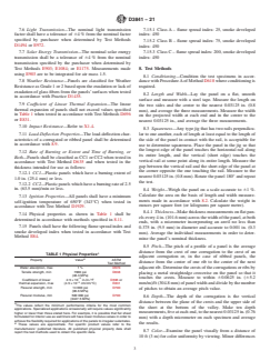 ABSTRACT This specification covers glass-fiber reinforced polyester plastic panels intended for use in construction. Light transmitting panels covered by this specification are divided into two types, based on relative response to a laboratory flammability test: Type CC1 for limited flammability and Type CC2 for general purpose. These types may be further subdivided by grades based on relative response to weathering tests: Grade 1 for weather resistance and Grade 2 for general purpose. The polyester resin used in the panels shall be a thermosetting styrenated and acrylated polyester resin composed of polymeric esters in which the recurring ester groups are an integral part of the main polymer chain. The resin shall be reinforced with glass fibers. The polyester resin may contain additives for various purposes. The materials shall be tested for water absorption, tensile strength, linear thermal expansion, and flexural strength. SCOPE 1.1 This specification covers the classification, materials of construction, workmanship, minimum physical requirements, and methods of testing glass-fiber reinforced polyester plastic panels intended for use in construction. Panels for specialized or unique applications have the potential to require values significantly above or below those stated in this specification. Recommended practices for certain specific applications are included as Appendix X1. This specification is not intended to restrict or limit technological changes affecting performance when those changes are agreed upon between the purchaser and the seller. 1.2 Supplementary information on chemical resistance, resistance to heat, and installation practices are provided in Appendix X1. 1.3 The classification of these plastic panels into types based on relative response to a laboratory test shall not be considered a fire hazard classification. 1.4 The values stated in inch-pound units are to be regarded as the standard. The values given in parentheses are for information only. 1.5 The text of this standard references notes and footnotes which provide explanatory material. These notes and footnotes (excluding those in Tables and Figures) shall not be considered as requirements of this standard. 1.6 Fire properties are determined by using laboratory flammability tests (Test Methods D635, D1929, and E84). 1.6.1 This standard is used to measure and describe the response of materials, products, or assemblies to heat and flame under controlled conditions, but does not by itself incorporate all factors required for fire hazard or fire risk assessment of the materials, products or assemblies under actual fire conditions. 1.6.2 Fire testing is inherently hazardous. Adequate safeguards for personnel and property shall be employed in conducting these tests. 1.7 The following precautionary caveat pertains only to the test method portion, Section 8 of this specification. This specification does not purport to address all of the safety concerns, if any, associated with its use. It is the responsibility of the user of this specification to establish appropriate safety and health practices and determine the applicability of regulatory limitations prior to use. Note 1: There is no known ISO equivalent to this standard. 1.8 This international standard was developed in accordance with internationally recognized principles on standardization established in the Decision on Principles for the Development of International Standards, Guides and Recommendations issued by the World Trade Organization Technical Barriers to Trade (TBT) Committee.