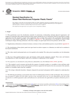 1.1 This specification covers the classification, materials of construction, workmanship, minimum physical requirements, and methods of testing glass-fiber reinforced polyester plastic panels intended for use in construction. Panels for specialized or unique applications have the potential to require values significantly above or below those stated in this specification. Recommended practices for certain specific applications are included as Appendix X1. This specification is not intended to restrict or limit technological changes affecting performance when those changes are agreed upon between the purchaser and the seller.