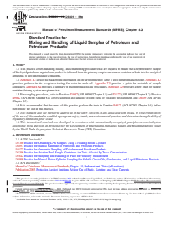 SIGNIFICANCE AND USE 4.1 Representative samples of petroleum and petroleum products are required for the determination of chemical and physical properties used to establish standard volumes, prices, and compliance with commercial and regulatory specifications. The handling of samples from the time of collection until they are analyzed requires care and effort to maintain their compositional integrity. Samples of high RVP (unstabilized) hydrocarbons are required at many measurement points, for example offshore production, at the outlets of test separators or to allow calibration of a flowmeter. This practice also describes requirements associated with handling and mixing samples held within pressurized cylinders. 4.2 Practice D4057 (API MPMS Chapter 8.1), Practice D4177 (API MPMS Chapter 8.2), Practice D5854 (API MPMS Chapter 8.3), Practice D5842 (API MPMS Chapter 8.4), and Practice D8009 (API MPMS Chapter 8.5). The primary purpose of this suite of standards, is to ensure proper sampling and handling for custody transfer applications. There are a significant number of test methods that may be used to analyze the samples taken by techniques described in API MPMS Chapter 8.1 and 8.2. For samples that are taken for test methods outside the general scope of custody transfer covered by this practice, the personnel assigned to take the sample are responsible to refer to the test methods for additional critical information that may impact the sampling process, that is, specific container selection, transport methods, storage times, etc. Those requirements should be found in the appropriate test method. SCOPE 1.1 This practice covers handling, mixing, and conditioning procedures that are required to ensure that a representative sample of the liquid petroleum or petroleum product is delivered from the primary sample container or container or both into the analytical apparatus or into intermediate containers. 1.2 Appendix X1 details the background information on the development of Table 1 used in performance testing. Appendix X2 provides guidance in the acceptance testing for water in crude oil. Appendix X3 provides a guide for materials of sample containers. Appendix X4 provides a summary of recommended mixing procedures. Appendix X5 provides a flow chart for sample container/mixing system acceptance test. 1.3 For sampling procedures, refer to Practices D4057 (API MPMS Chapter 8.1) and D4177 (API MPMS Chapter 8.2). Practice D5842 (API MPMS Chapter 8.4) covers sampling and handling of light fuels for volatility measurement, and D8009 (API MPMS Chapter 8.5). 1.4 It is recommended that the users of this practice perform the tests in Practice D4177 (API MPMS Chapter 8.2) before performing the test in this practice. 1.5 This standard does not purport to address all of the safety concerns, if any, associated with its use. It is the responsibility of the user of this standard to establish appropriate safety, health, and environmental practices and determine the applicability of regulatory limitations prior to use. 1.6 This international standard was developed in accordance with internationally recognized principles on standardization established in the Decision on Principles for the Development of International Standards, Guides and Recommendations issued by the World Trade Organization Technical Barriers to Trade (TBT) Committee.