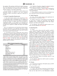 ASTM B236/B236M-23 is a technical specification published by ASTM International. Its full title is "Standard Specification for Aluminum Bars for Electrical Purposes (Bus Bars)". This standard covers: ABSTRACT This specification covers Aluminum 1350 bar for electric conductors in the tempers. The tempers are designated as H12, H112, and H111. The products covered by this specification shall be produced by extruding or rolling. Bars in the H12 temper shall be furnished with a rolled mill finish; bars in the H111 temper, with an as-extruded mill finish; and bars in the H112 temper, with a rolled mill finish except that the edges shall be as sawed. The bars shall be subjected to tension test to determine their tensile and yield strengths. Bars in the H12, and H111, and H112 tempers shall be capable of being bent flatwise at room temperature, through an angle of 90° around a pin or mandrel having a radius equal to the thickness of the specimen, without cracking or evidence of slivers or other imperfections. For a flatwise bend, the pin or mandrel shall be 90° from the working (extrusion or rolling) direction, and across the greater (width) dimension of the bar. The required 90° bend shall be in the working (extrusion or rolling) direction. Bars in the H12 and H111 tempers whose width-to-thickness ratios are not in excess of 12 and whose width is 100 mm or less, shall be capable of being bent at room temperature edgewise 90° around a mandrel without cracking or localized thinning to less than 90 % of the maximum thickness within the central 60° of the bend when measured along the outer edge of the bend. Electrical resistivity and conductivity shall be measured. SCOPE 1.1 This specification covers Aluminum 1350 bar for electric conductors in the tempers shown in Table 1. 1.2 Aluminum and temper designations are in accordance with ANSI H35.1/H35.1(M). The equivalent Unified Numbering System designation is A91350 in accordance with Practice E527. Note 1: For Alloy 6101 bus conductors, refer to Specification B317/B317M. Note 2: Prior to 1975, Aluminum 1350 was designated as EC aluminum. 1.3 The values stated in either SI or inch-pound units are to be regarded separately as standard. The values stated in each system may not be exact equivalents; therefore each system shall be used independently of the other. Combining values from the two systems may result in non-conformance with the standard. 1.4 For acceptance criteria for inclusion of new aluminum and aluminum alloys in this specification, see Annex A2. 1.5 This standard does not purport to address all of the safety concerns, if any, associated with its use. It is the responsibility of the user of this standard to establish appropriate safety, health, and environmental practices and determine the applicability of regulatory limitations prior to use. 1.6 This international standard was developed in accordance with internationally recognized principles on standardization established in the Decision on Principles for the Development of International Standards, Guides and Recommendations issued by the World Trade Organization Technical Barriers to Trade (TBT) Committee.
