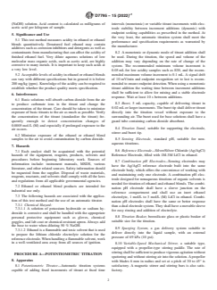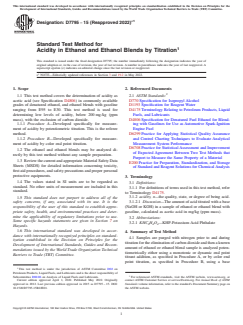 ASTM D7795-15(2022)e1 is a standard published by ASTM International. Its full title is "Standard Test Method for Acidity in Ethanol and Ethanol Blends by Titration". This standard covers: SIGNIFICANCE AND USE 5.1 This test method measures acidity in ethanol or ethanol blends quantitatively. Denatured fuel ethanol may contain additives such as corrosion inhibitors and detergents as well as contaminants from manufacturing that can affect the acidity of finished ethanol fuel. Very dilute aqueous solutions of low molecular mass organic acids, such as acetic acid, are highly corrosive to many metals. It is important to keep such acids at a very low level. 5.2 Acceptable levels of acidity in ethanol or ethanol blends can vary with different specifications but in general it is below 200 mg/kg (ppm). Knowledge of the acidity can be required to establish whether the product quality meets specification. SCOPE 1.1 This test method covers the determination of acidity as acetic acid (see Specification D4806) in commonly available grades of denatured ethanol, and ethanol blends with gasoline ranging from E95 to E30. This test method is used for determining low levels of acidity, below 200 mg/kg (ppm mass), with the exclusion of carbon dioxide. 1.1.1 Procedure A—Developed specifically for measurement of acidity by potentiometric titration. This is the referee method. 1.1.2 Procedure B—Developed specifically for measurement of acidity by color end point titration. 1.2 The ethanol and ethanol blends may be analyzed directly by this test method without any sample preparation. 1.3 Review the current and appropriate Material Safety Data Sheets (MSDS) for detailed information concerning toxicity, first aid procedures, and safety precautions and proper personal protective equipments. 1.4 The values stated in SI units are to be regarded as standard. No other units of measurement are included in this standard. 1.5 This standard does not purport to address all of the safety concerns, if any, associated with its use. It is the responsibility of the user of this standard to establish appropriate safety, health, and environmental practices and determine the applicability of regulatory limitations prior to use. Some specific hazards statements are given in Section 7 on Hazards. 1.6 This international standard was developed in accordance with internationally recognized principles on standardization established in the Decision on Principles for the Development of International Standards, Guides and Recommendations issued by the World Trade Organization Technical Barriers to Trade (TBT) Committee.