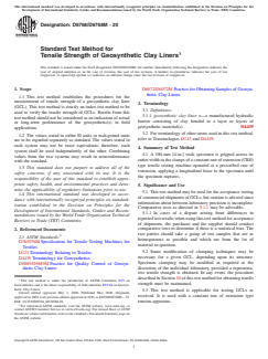ASTM D6768/D6768M-20 is a standard published by ASTM International. Its full title is "Standard Test Method for Tensile Strength of Geosynthetic Clay Liners". This standard covers: SIGNIFICANCE AND USE 5.1 This test method may be used for the acceptance testing of commercial shipments of GCLs, but caution is advised since information about between-laboratory precision is incomplete. Comparative tests as directed in 5.1.1 may be advisable. 5.1.1 In cases of a dispute arising from differences in reported test results when using this test method for acceptance of shipments, the purchaser and the supplier should conduct comparative tests to determine if there is a statistical bias. The two parties should take a group of test samples that are as homogeneous as possible and which are from the lot of material in question. 5.2 Some modification of clamping techniques may be necessary for a given GCL, depending upon its structure. Specimen clamping may be modified as required at the discretion of the individual laboratory, provided a representative tensile strength is obtained. In any event, the procedure described in Section 10 of this test method for obtaining tensile strength must be maintained. 5.3 This test method is applicable for testing GCLs as received. It is used with a constant rate of extension type tension apparatus. SCOPE 1.1 This test method establishes the procedures for the measurement of tensile strength of a geosynthetic clay liner (GCL). This test method is strictly an index test method to be used to verify the tensile strength of GCLs. Results from this test method should not be considered as an indication of actual or long-term performance of the geosynthetic(s) in field applications. 1.2 The values stated in either SI units or inch-pound units are to be regarded separately as standard. The values stated in each system may not be exact equivalents; therefore, each system shall be used independently of the other. Combining values from the two systems may result in nonconformance with the standard. 1.3 This standard does not purport to address all of the safety concerns, if any, associated with its use. It is the responsibility of the user of this standard to establish appropriate safety, health, and environmental practices and determine the applicability of regulatory limitations prior to use. 1.4 This international standard was developed in accordance with internationally recognized principles on standardization established in the Decision on Principles for the Development of International Standards, Guides and Recommendations issued by the World Trade Organization Technical Barriers to Trade (TBT) Committee.