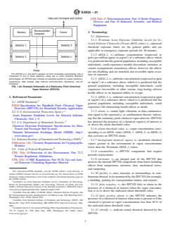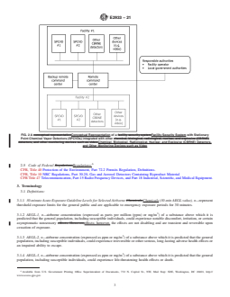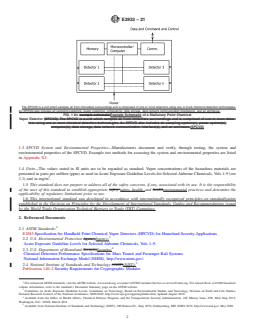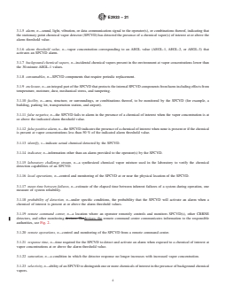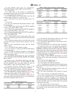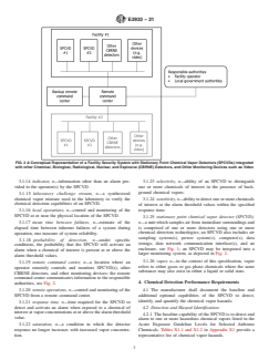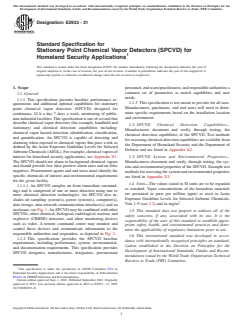 ABSTRACT This specification establishes the baseline performance requirements and additional optional capabilities for stationary point chemical vapor detectors (SPCVD) intended for continuous monitoring of public, non-industrial facilities 24 hours a day, 7 days a week. It provides SPCVD designers, manufacturers, integrators, procurement personnel, end users/practitioners, and responsible authorities a common set of parameters to match capabilities and user needs. The document specifies chemical detection performance requirements, system requirements, environmental requirements, manuals and documentation, and product marking. SCOPE 1.1 General: 1.1.1 This specification presents baseline performance requirements and additional optional capabilities for stationary point chemical vapor detectors (SPCVD) designed for continuous, 24 h a day 7 days a week, monitoring of public, non-industrial facilities. This specification is one of several that describe chemical vapor detectors (for example, handheld and stationary) and chemical detection capabilities including: chemical vapor hazard detection, identification, classification, and quantification. An SPCVD is capable of detecting and alarming when exposed to chemical vapors that pose a risk as defined by the Acute Exposure Guideline Levels for Selected Airborne Chemicals (AEGL). For example, chemical vapors of interest for homeland security applications, see Appendix X1. The SPCVD should not alarm to background chemical vapors and should provide low false positive alarm rates and no false negatives. Procurement agents and end users must identify the specific chemicals of interest and environmental requirements for the given facility. 1.1.1.1 An SPCVD samples air from immediate surroundings and is comprised of one or more detectors using one or more chemical detection technologies. An SPCVD also includes air sampling system(s), power system(s), computer(s), data storage, data network communication interface(s), and an enclosure, see Fig. 1. An SPCVD may be combined with other SPCVDs, other chemical, biological, radiological, nuclear, and explosive (CBRNE) detectors, and other monitoring devices such as video. A remote command center may monitor and control these devices and communicate information to the responsible authorities and responders, as depicted in Fig. 2. FIG. 1 An Example Schematic of a Stationary Point Chemical Vapor Detector (SPCVD) The SPCVD is a unit which samples air from immediate surroundings and is comprised of one or more detectors using one or more chemical detection technologies. An SPCVD also includes air sampling system(s), power system(s), computer(s), data storage, data network communication interface(s), and an enclosure. FIG. 2 A Conceptual Representation of a Facility Security System with Stationary Point Chemical Vapor Detectors (SPCVDs) integrated with other Chemical, Biological, Radiological, Nuclear, and Explosive (CBRNE) Detectors, and Other Monitoring Devices such as Video 1.1.2 This specification provides the SPCVD baseline requirements, including performance, system, environmental, and documentation requirements. This specification provides SPCVD designers, manufacturers, integrators, procurement personnel, end users/practitioners, and responsible authorities a common set of parameters to match capabilities and user needs. 1.1.3 This specification is not meant to provide for all uses. Manufacturers, purchasers, and end users will need to determine specific requirements based on the installation location and environment. 1.2 SPCVD Chemical Detection Capabilities—Manufacturers document and verify, through testing, the chemical detection capabilities of the SPCVD. Test methods for assessing chemical detection capabilities are available from the Department of Homeland Security and the Department of Defense and are listed in Appendix X2. 1.3 SPCVD System and Environmental Properties—Manufacturers document and veri...