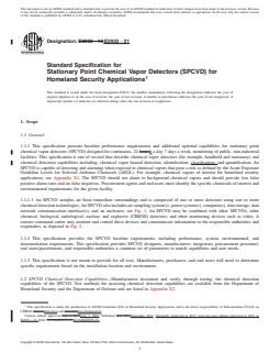 This specification establishes the baseline performance requirements and additional optional capabilities for stationary point chemical vapor detectors (SPCVD) intended for continuous monitoring of public, non-industrial facilities 24 hours a day, 7 days a week. It provides SPCVD designers, manufacturers, integrators, procurement personnel, end users/practitioners, and responsible authorities a common set of parameters to match capabilities and user needs. The document specifies chemical detection performance requirements, system requirements, environmental requirements, manuals and documentation, and product marking.
