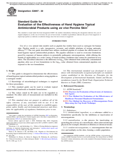 ASTM E2897-22 is a guide published by ASTM International. Its full title is "Standard Guide for Evaluation of the Effectiveness of Hand Hygiene Topical Antimicrobial Products using <emph type="bdit">ex vivo</emph> Porcine Skin". This standard covers: SIGNIFICANCE AND USE 5.1 The guide may be used to demonstrate the effectiveness of topical antimicrobial products using pigskin as a surrogate for human skin and the cup scrub technique for sampling. 5.2 The techniques described can be used to simulate Test Method E1174 and will use the pigskin substrate to overcome limitations posed by exposure of human subjects to potentially pathogenic microorganisms, while offering the benefit of applicability to a wide variety of hand-washing conditions that cannot be simulated in test tubes. 5.3 Use of the pigskin surrogate offers less expensive and higher throughput screening. SCOPE 1.1 This guide is designed to demonstrate the effectiveness of hand hygiene topical antimicrobial products using pigskin as a surrogate model. 1.2 Knowledge of microbiological techniques is required for these procedures. 1.3 This standard guide can be used to evaluate topical antimicrobial handwash or handrub formulations. 1.4 The values stated in SI units are to be regarded as standard. No other units of measurement are included in this standard. 1.5 This standard does not purport to address all of the safety concerns, if any, associated with its use. It is the responsibility of the user of this standard to establish appropriate safety, health, and environmental practices and determine the applicability of regulatory limitations prior to use. 1.6 This international standard was developed in accordance with internationally recognized principles on standardization established in the Decision on Principles for the Development of International Standards, Guides and Recommendations issued by the World Trade Organization Technical Barriers to Trade (TBT) Committee.