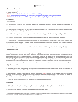SIGNIFICANCE AND USE 5.1 The guide may be used to demonstrate the effectiveness of topical antimicrobial products using pigskin as a surrogate for human skin and the cup scrub technique for sampling. 5.2 The techniques described can be used to simulate Test Method E1174 and will use the pigskin substrate to overcome limitations posed by exposure of human subjects to potentially pathogenic microorganisms, while offering the benefit of applicability to a wide variety of hand-washing conditions that cannot be simulated in test tubes. 5.3 Use of the pigskin surrogate offers less expensive and higher throughput screening. SCOPE 1.1 This guide is designed to demonstrate the effectiveness of hand hygiene topical antimicrobial products using pigskin as a surrogate model. 1.2 Knowledge of microbiological techniques is required for these procedures. 1.3 This standard guide can be used to evaluate topical antimicrobial handwash or handrub formulations. 1.4 The values stated in SI units are to be regarded as standard. No other units of measurement are included in this standard. 1.5 This standard does not purport to address all of the safety concerns, if any, associated with its use. It is the responsibility of the user of this standard to establish appropriate safety, health, and environmental practices and determine the applicability of regulatory limitations prior to use. 1.6 This international standard was developed in accordance with internationally recognized principles on standardization established in the Decision on Principles for the Development of International Standards, Guides and Recommendations issued by the World Trade Organization Technical Barriers to Trade (TBT) Committee.