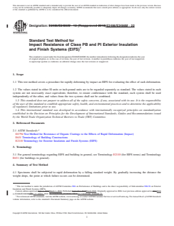 SIGNIFICANCE AND USE 5.1 This specification determines levels of impact resistance under Classes PB and PI EIFS. 5.2 This test method does not purport to simulate impact encountered in service. SCOPE 1.1 This test method covers a procedure for rapidly deforming by impact an EIFS for evaluating the effect of such deformation. 1.2 The values stated in either SI units or inch-pound units are to be regarded separately as standard. The values stated in each system are not necessarily exact equivalents; therefore, to ensure conformance with the standard, each system shall be used independently of the other, and values from the two systems shall not be combined. 1.3 This standard does not purport to address all of the safety concerns, if any, associated with its use. It is the responsibility of the user of this standard to establish appropriate safety, health, and environmental practices and to determine the applicability of regulatory limitations prior to use. 1.4 This international standard was developed in accordance with internationally recognized principles on standardization established in the Decision on Principles for the Development of International Standards, Guides and Recommendations issued by the World Trade Organization Technical Barriers to Trade (TBT) Committee.