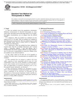 ASTM D4193-08(2020)e1, titled "Standard Test Method for Thiocyanate in Water," provides a quantitative colorimetric laboratory method for measuring dissolved thiocyanate in water, including wastewater and saline water, within the range of 0.1 to 2.0 mg/L. This standard, developed by ASTM International, is significant for analyzing natural waters and a variety of industrial effluents where thiocyanate may be present due to organic decomposition or industrial processes. The method specifically addresses the detection and measurement of thiocyanate, an important analyte in environmental and industrial water quality management.