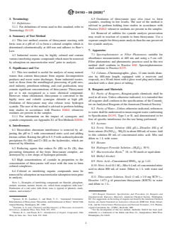 SIGNIFICANCE AND USE 5.1 This test method is useful for analysis of many natural waters that contain thiocyanate from organic decomposition products and waste water discharges. Some industrial wastes, such as those from the metallurgical processing of gold ores, steel industry, petroleum refining, and coal gasification, may contain significant concentrations of thiocyanate. Thiocyanate per se is not recognized as a toxic chemical compound. However, when chlorinated, thiocyanate is converted to the highly toxic and volatile cyanogen chloride at high pH. Oxidation of thiocyanate may also release toxic hydrogen cyanide. The user of the method is advised to perform holding time studies in accordance with Practice D4841 whenever oxidants are present in the samples. 5.1.1 For information on the impact of cyanogens and cyanide compounds, see Appendix X1 of Test Methods D2036. SCOPE 1.1 This test method covers the quantitative colorimetric laboratory measurement of dissolved thiocyanate in water, waste water, and saline water in the range from 0.1 to 2.0 mg/L. For higher concentrations, use an aliquot from the diluted sample. 1.1.1 Validation—This test method was validated over the range of 0.07 to 1.42 mg/L. This test method was validated at nine laboratories at four levels. This test method may be valid for reporting results down to lower levels as validated in individual user laboratories. 1.1.2 Application—This test method has been validated in reagent water, Type II, in multiple laboratories and 7 natural waters, 1 laboratory effluent, 1 steel mill effluent, and 2 dechlorinated and treated sanitary effluents in single laboratories. It is the user’s responsibility to assure the validity of the test method on any untested matrices. 1.2 The values stated in SI units are to be regarded as standard. No other units of measurement are included in this standard. 1.3 This standard does not purport to address all of the safety concerns, if any, associated with its use. It is the responsibility of the user of this standard to establish appropriate safety, health, and environmental practices and determine the applicability of regulatory limitations prior to use. For specific hazard statements, see Section 9. 1.4 This international standard was developed in accordance with internationally recognized principles on standardization established in the Decision on Principles for the Development of International Standards, Guides and Recommendations issued by the World Trade Organization Technical Barriers to Trade (TBT) Committee.