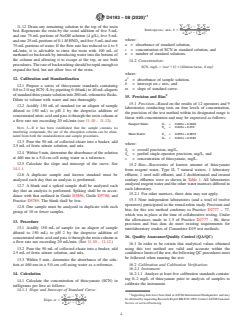 ASTM D4193-08(2020)e1 is a standard published by ASTM International. Its full title is "Standard Test Method for Thiocyanate in Water". This standard covers: SIGNIFICANCE AND USE 5.1 This test method is useful for analysis of many natural waters that contain thiocyanate from organic decomposition products and waste water discharges. Some industrial wastes, such as those from the metallurgical processing of gold ores, steel industry, petroleum refining, and coal gasification, may contain significant concentrations of thiocyanate. Thiocyanate per se is not recognized as a toxic chemical compound. However, when chlorinated, thiocyanate is converted to the highly toxic and volatile cyanogen chloride at high pH. Oxidation of thiocyanate may also release toxic hydrogen cyanide. The user of the method is advised to perform holding time studies in accordance with Practice D4841 whenever oxidants are present in the samples. 5.1.1 For information on the impact of cyanogens and cyanide compounds, see Appendix X1 of Test Methods D2036. SCOPE 1.1 This test method covers the quantitative colorimetric laboratory measurement of dissolved thiocyanate in water, waste water, and saline water in the range from 0.1 to 2.0 mg/L. For higher concentrations, use an aliquot from the diluted sample. 1.1.1 Validation—This test method was validated over the range of 0.07 to 1.42 mg/L. This test method was validated at nine laboratories at four levels. This test method may be valid for reporting results down to lower levels as validated in individual user laboratories. 1.1.2 Application—This test method has been validated in reagent water, Type II, in multiple laboratories and 7 natural waters, 1 laboratory effluent, 1 steel mill effluent, and 2 dechlorinated and treated sanitary effluents in single laboratories. It is the user’s responsibility to assure the validity of the test method on any untested matrices. 1.2 The values stated in SI units are to be regarded as standard. No other units of measurement are included in this standard. 1.3 This standard does not purport to address all of the safety concerns, if any, associated with its use. It is the responsibility of the user of this standard to establish appropriate safety, health, and environmental practices and determine the applicability of regulatory limitations prior to use. For specific hazard statements, see Section 9. 1.4 This international standard was developed in accordance with internationally recognized principles on standardization established in the Decision on Principles for the Development of International Standards, Guides and Recommendations issued by the World Trade Organization Technical Barriers to Trade (TBT) Committee.