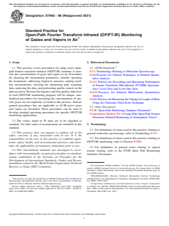 ASTM E1982-98(2021) is a standard published by ASTM International. Its full title is "Standard Practice for Open-Path Fourier Transform Infrared (OP/FT-IR) Monitoring of Gases and Vapors in Air". This standard covers: SIGNIFICANCE AND USE 4.1 An OP/FT-IR monitor can, in principle, measure the concentrations of all IR-active gases and vapors in the atmosphere. Detailed descriptions of OP/FT-IR systems and the fundamental aspects of their operation are given in Practice E1685 and the FT-IR Open-Path Monitoring Guidance Document. A method for processing OP/FT-IR data to obtain the concentrations of gases over a long, open path is given in Compendium Method TO-16. Applications of OP/FT-IR systems include monitoring for gases and vapors in ambient air, along the perimeter of an industrial facility, at hazardous waste sites and landfills, in response to accidental chemical spills or releases, and in workplace environments. SCOPE 1.1 This practice covers procedures for using active open-path Fourier transform infrared (OP/FT-IR) monitors to measure the concentrations of gases and vapors in air. Procedures for choosing the instrumental parameters, initially operating the instrument, addressing logistical concerns, making ancillary measurements, selecting the monitoring path, acquiring data, analyzing the data, and performing quality control on the data are given. Because the logistics and data quality objectives of each OP/FT-IR monitoring program will be unique, standardized procedures for measuring the concentrations of specific gases are not explicitly set forth in this practice. Instead, general procedures that are applicable to all IR-active gases and vapors are described. These procedures can be used to develop standard operating procedures for specific OP/FT-IR monitoring applications. 1.2 The values stated in SI units are to be regarded as standard. No other units of measurement are included in this standard. 1.3 This practice does not purport to address all of the safety concerns, if any, associated with its use. It is the responsibility of the user of this practice to establish appropriate safety, health, and environmental practices and determine the applicability of regulatory limitations prior to use. 1.4 This international standard was developed in accordance with internationally recognized principles on standardization established in the Decision on Principles for the Development of International Standards, Guides and Recommendations issued by the World Trade Organization Technical Barriers to Trade (TBT) Committee.