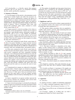 SIGNIFICANCE AND USE 5.1 The practice can be used to evaluate coupon materials of any composition, insofar as the coupon can be small enough to fit inside filter units mentioned in 4.1. 5.2 This practice defines procedures that are quantitative, scalable, rapid, sensitive, and safe, while minimizing labor and addressing statistical confidence (1, 2). 5.2.1 Quantitative—The total number of spores per coupon is determined by dilution-plating, and all spores remaining on the coupon are assayed for activity in the extraction tube to provide confidence that all the spores were accounted for. 5.2.2 Statistical Confidence—The use of five independent preparations of spore inocula for a statistical n of 5. 5.2.3 Sensitivity—Allows for complete detection of all culturable spores inoculated on a coupon, including the spores that remain attached to the coupon. 5.2.3.1 The limit of detection is dependent on the culturability of fully matured spores to germinate, outgrow and divide in the presence of the extraction medium (1% tryptic soy broth, 100 mM L-Alanine, 1 mM inosine, 0.05% Tween 80) and/or on tryptic soy agar. 5.2.3.2 Results presented in Refs (1, 3) (and currently unpublished results) indicate that these media, combined with the test temperatures and conditions described herein will generate results with a high level of practical confidence for detecting culturable Bacillus spores. 5.2.4 Safety—Inoculated coupons are contained within filter units. 5.2.5 Simplicity of Testing—Tests and extractions are performed in the same filter unit to minimize coupon handling steps. 5.2.6 Scalable and Rapid—A maximum of 36 samples can be processed in 1 h by two technicians; a total of 300 samples have been processed by six technicians in 5 h (1, 2). 5.2.7 Wide application for numerous Bacillus species and strains. The method has also been modified and used for vegetative bacteria and viruses as well (1, 2). SCOPE 1.1 This practice is used to quantify the efficacy of liquid or solid decontaminants on Bacillus spores dried on the surface of coupons made from porous and non-porous materials. This practice can distinguish between bactericidal and bacteriostatic chemicals within decontamination mixtures. This is important because many decontaminants contain both reactive compounds and high concentrations of bacteriostatic surfactants. All test samples are directly compared to pre-neutralized controls, un-inoculated negative growth controls, and solution controls on the same day as the test in order to increase practical confidence in the inactivation data. 1.2 This procedure should be performed only by those trained in microbiological techniques, are familiar with antimicrobial (sporicidal) agents and the application instructions of the antimicrobial products. 1.3 The values stated in SI units are to be regarded as standard. No other units of measurement are included in this standard. 1.4 This standard may involve hazardous materials, operations, and equipment. This standard does not purport to address all of the safety concerns, if any, associated with its use. It is the responsibility of the user of this standard to establish appropriate safety, health, and environmental practices and determine the applicability of regulatory limitations prior to use. 1.5 This international standard was developed in accordance with internationally recognized principles on standardization established in the Decision on Principles for the Development of International Standards, Guides and Recommendations issued by the World Trade Organization Technical Barriers to Trade (TBT) Committee.