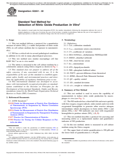 ASTM E3351-22 is a standard published by ASTM International. Its full title is "Standard Test Method for Detection of Nitric Oxide Production <emph type="bdit">In Vitro</emph >". This standard covers: SIGNIFICANCE AND USE 5.1 This test method is designed to evaluate nanomaterial capacity to induce nitric oxide production by macrophages. 5.2 Activated macrophages generate large quantities of NO. NO generated from activated macrophages is a cytostatic/cytotoxic agent (3-6). 5.3 The production of NO in excessive amounts leads to the generation of peroxynitrite by its spontaneous reaction with superoxide. Peroxynitrite causes tissue injury through its capability to damage lipids, proteins, and DNA (2). 5.4 NO is a proinflammatory mediator and it is an important marker for activation of inflammation (5, 6). 5.5 Testing the capacity of a nanomaterial to induce NO production in vitro helps in predicting the nanomaterial’s biocompatibility through anticipating and understanding the potential problems that might be encountered during its in vivo administration. SCOPE 1.1 This test method delivers a protocol for a quantitative measure of nitrite (NO2–), a stable end-product of nitric oxide (NO), in cell culture medium due to exposure to nanomaterial(s). 1.2 NO has a critical role in several pathological conditions in addition to its role in many physiological processes. 1.3 This test method uses murine macrophage cell line RAW 264.7 as an in vitro model. 1.4 The nitrite is measured in the cell culture medium by a colorimetric analysis using Griess reagent as shown in Fig. 1. FIG. 1 Summary of Nitric Oxide Production Assay 1.5 This standard does not purport to address all of the safety concerns, if any, associated with its use. It is the responsibility of the user of this standard to establish appropriate safety, health, and environmental practices and determine the applicability of regulatory limitations prior to use. 1.6 This international standard was developed in accordance with internationally recognized principles on standardization established in the Decision on Principles for the Development of International Standards, Guides and Recommendations issued by the World Trade Organization Technical Barriers to Trade (TBT) Committee.
