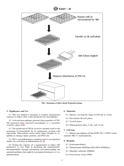 SIGNIFICANCE AND USE 5.1 This test method is designed to evaluate nanomaterial capacity to induce nitric oxide production by macrophages. 5.2 Activated macrophages generate large quantities of NO. NO generated from activated macrophages is a cytostatic/cytotoxic agent (3-6). 5.3 The production of NO in excessive amounts leads to the generation of peroxynitrite by its spontaneous reaction with superoxide. Peroxynitrite causes tissue injury through its capability to damage lipids, proteins, and DNA (2). 5.4 NO is a proinflammatory mediator and it is an important marker for activation of inflammation (5, 6). 5.5 Testing the capacity of a nanomaterial to induce NO production in vitro helps in predicting the nanomaterial’s biocompatibility through anticipating and understanding the potential problems that might be encountered during its in vivo administration. SCOPE 1.1 This test method delivers a protocol for a quantitative measure of nitrite (NO2–), a stable end-product of nitric oxide (NO), in cell culture medium due to exposure to nanomaterial(s). 1.2 NO has a critical role in several pathological conditions in addition to its role in many physiological processes. 1.3 This test method uses murine macrophage cell line RAW 264.7 as an in vitro model. 1.4 The nitrite is measured in the cell culture medium by a colorimetric analysis using Griess reagent as shown in Fig. 1. FIG. 1 Summary of Nitric Oxide Production Assay 1.5 This standard does not purport to address all of the safety concerns, if any, associated with its use. It is the responsibility of the user of this standard to establish appropriate safety, health, and environmental practices and determine the applicability of regulatory limitations prior to use. 1.6 This international standard was developed in accordance with internationally recognized principles on standardization established in the Decision on Principles for the Development of International Standards, Guides and Recommendations issued by the World Trade Organization Technical Barriers to Trade (TBT) Committee.